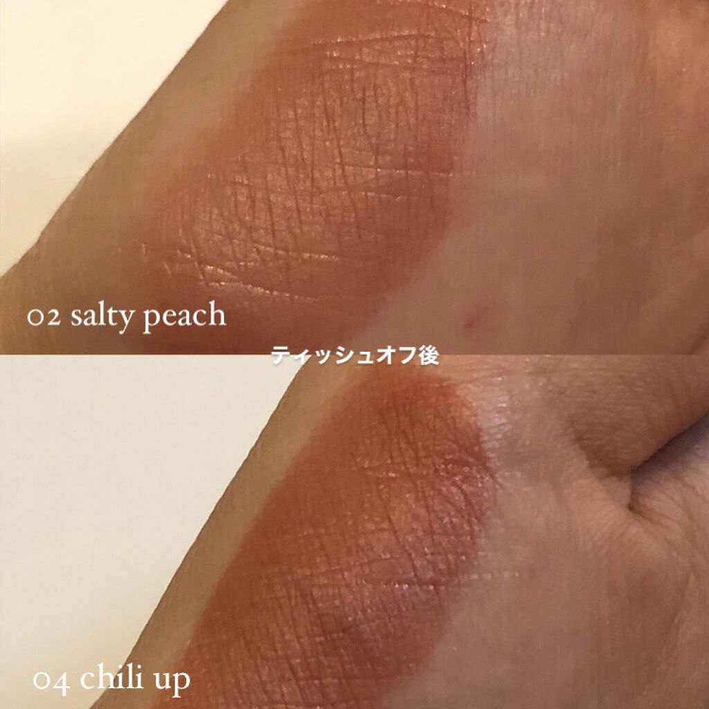 - <01 インコーラル> 水、ビスジグリセリルポリアシルアジペート-2、グリセリン、ジフェニルジメチコン、ジフェニルシロキシフェニルトリメチコン、ポリグリセリン-3、リンゴ酸ジイソステアリル、水添ポリイソブテン、ポリブテン、トリメチルシロキシフェニルジメチコン、変性アルコール、ポリソルベート60、イソノナン酸イソノニル、ペンチレングリコール、(アクリル酸ヒドロキシエチル/アクリロイルジメチルタウリンNa)コポ リマー、ラベンダーエキス、ハナハッカ花/葉/茎エキス、ローズマリーエキス、タイムエキス、ステアリン酸グリセリル、ステアリン酸PEG-100、スクワラン、ラウリルPEG-10トリス(トリメチルシロキシ)シリルエチルジメチコン、エチルヘキシルグリセリン、デキストリン、ステビオシド、イソステアリン酸ソルビタン、エチレンジアミンジコハク酸3Na、水酸化Al、ポリアクリル酸アンモニウム、BG、トコフェロール、フェノキシエタノール、香料、リモネン、酸化チタン、黄5、赤227、黄4、青1 <03 イフローズ> 水、ビスジグリセリルポリアシルアジペート-2、グリセリン、ジフェニルジメチコン、ジフェニルシロキシフェニルトリメチコン、ポリグリセリン-3、リンゴ酸ジイソステアリル、水添ポリイソブテン、ポリブテン、トリメチルシロキシフェニルジメチコン、変性アルコール、ポリソルベート60、イソノナン酸イソノニル、ペンチレングリコール、(アクリル酸ヒドロキシエチル/アクリロイルジメチルタウリンNa)コポリマー、ラベンダーエキス、ハナハッカ花/葉/茎エキス、ローズマリーエキス、タイムエキス、ステアリン酸グリセリル、ステアリン酸PEG-100、スクワラン、ラウリルPEG-10トリス(トリメチルシロキシ)シリルエチルジメチコン、エチルヘキシルグリセリン、デキストリン、ステビオシド、トリイソステアリン酸ポリグリセリル-2、イソステアリン酸ソルビタン、エチレンジアミンジコハク酸3Na、水酸化Al、ポリアクリル酸アンモニウム、BG、トコフェロール、フェノキシエタノール、香料、リモネン、酸化チタン、黄5、赤227、青1、黄4、赤218 <04 チリアップ> 水、ビスジグリセリルポリアシルアジペート-2、グリセリン、ジフェニルジメチコン、ジフェニルシロキシフェニルトリメチコン、ポリグリセリン-3、リンゴ酸ジイソステアリル、水添ポリイソブテン、ポリブテン、トリメチルシロキシフェニルジメチコン、変性アルコール、ポリソルベート60、イソノナン酸イソノニル、ペンチレングリコール、(アクリル酸ヒドロキシエチル/アクリロイルジメチルタウリンNa)コポ リマー、ラベンダーエキス、ハナハッカ花/葉/茎エキス、ローズマリーエキス、タイムエキス、ステアリン酸グリセリル、ステアリン酸PEG-100、スクワラン、ラウリルPEG-10トリス(トリメチルシロキシ)シリルエチルジメチコン、エチルヘキシルグリセリン、デキストリン、ステビオシド、イソステアリン酸ソルビタン、エチレンジアミンジコハク酸3Na、トコフェロール、BG、フェノキシエタノール、料、リモネン、黄5、赤227、黄4、青1 <06 チュリアン> 水、ビスジグリセリルポリアシルアジペート-2、グリセリン、ジフェニルジメチコン、ジフェニルシロキシフェニルトリメチコン、ポリグリセリン-3、リンゴ酸ジイソステアリル、水添ポリイソブテン、ポリブテン、トリメチルシロキシフェニルジメチコン、変性アルコール、ポリソルベート60、イソノナン酸イソノニル、ペンチレングリコール、(アクリル酸ヒドロキシエチル/アクリロイルジメチルタウリンNa)コポリマー、ラベンダーエキス、ハナハッカ花/葉/茎エキス、ローズマリーエキス、タイムエキス、ステアリン酸グリセリル、ステアリン酸PEG-100、スクワラン、ラウリルPEG-10トリス(トリメチルシロキシ)シリルエチルジメチコン、エチルヘキシルグリセリン、デキストリン、ステビオシド、イソステアリン酸ソルビタン、エチレンジアミンジコハク酸3Na、水酸化Al、ポリアクリル酸アンモニウム、BG、トコフェロール、フェノキシエタノール、香料、リモネン、酸化チタン、黄5、赤227、酸化鉄、黄4、赤218、青1 <08 ベリーディヴァイン> 水、ビスジグリセリルポリアシルアジペート-2、グリセリン、ジフェニルジメチコン、ジフェニルシロキシフェニルトリメチコン、ポリグリセリン-3、リンゴ酸ジイソステアリル、水添ポリイソブテン、ポリブテン、トリメチルシロキシフェニルジメチコン、変性アルコール、ポリソルベート60、イソノナン酸イソノニル、ペンチレングリコール、(アクリル酸ヒドロキシエチル/アクリロイルジメチルタウリンNa)コポリマー、ラベンダーエキス、ハナハッカ花/葉/茎エキス、ローズマリーエキス、タイムエキス、ステアリン酸グリセリル、ステアリン酸PEG-100、スクワラン、ラウリルPEG-10トリス(トリメチルシロキシ)シリルエチルジメチコン、エチルヘキシルグリセリン、イソステアリン酸ソルビタン、デキストリン、ステビオシド、エチレンジアミン