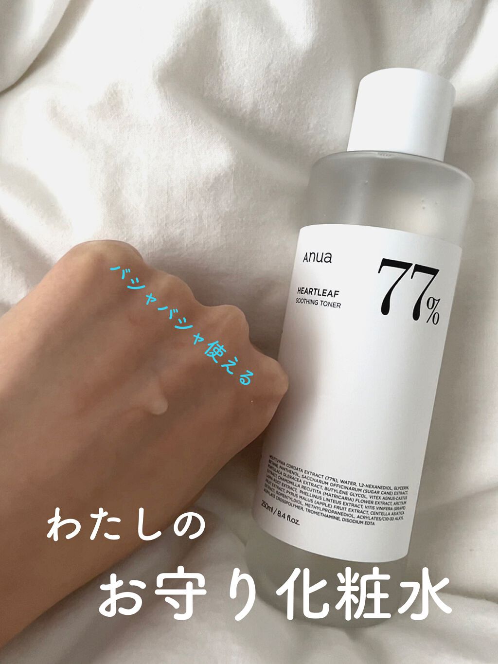 Anua ドクダミ77スージングトナー250ml¥2,380前に使ったことがあっていいかもと思って購入無色透明無臭シャバシャバさらさらで肌馴染みよくべたべたしないぶつぶつできたしヒリヒリしたから使ってない使うのやめたら刺激なかったからこれが原...