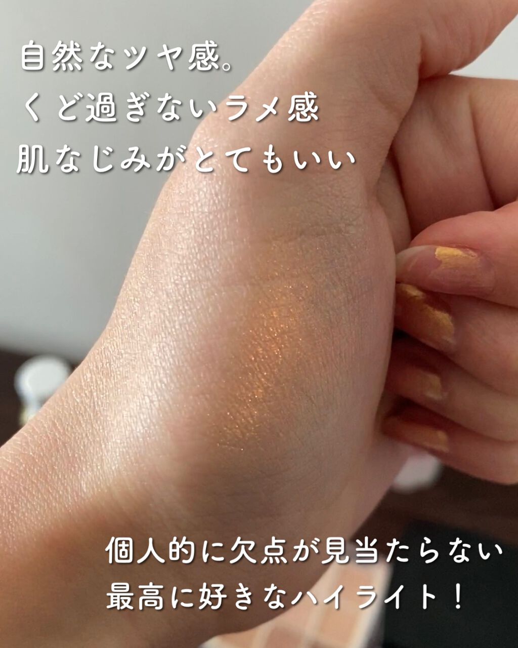 手やブラシに取るとしっとり 肌に乗せるとサラサラで発光ツヤ感がたまらなくキレイ😍 ピンクパールにクリアな多色ラメがぎっしりで存在感はあるけど自然に盛れる🙂↕️ 朝から夕方まで崩れにくく、仕上がりキープしてくれるし買って正解でした😇
