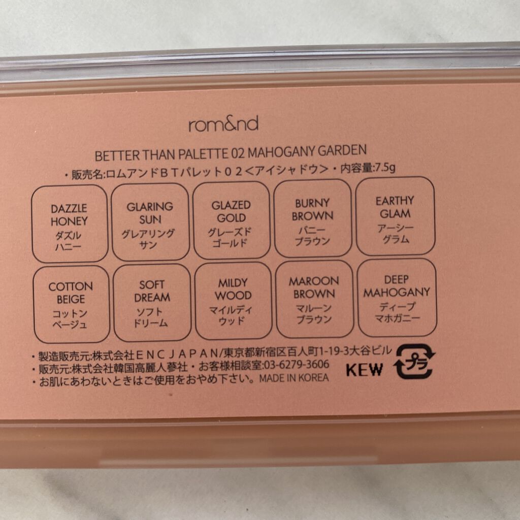 ロムアンドのアイシャドウ02番MAHOGANYGARDENを購入してみました。ロムアンドのアイシャドウを初めて購入してみました。発色が見たままの発色で粉質が非常に細かく、ふんわり仕上がるところが好きです😊02番はブラウンの色味のアイシャドウで...