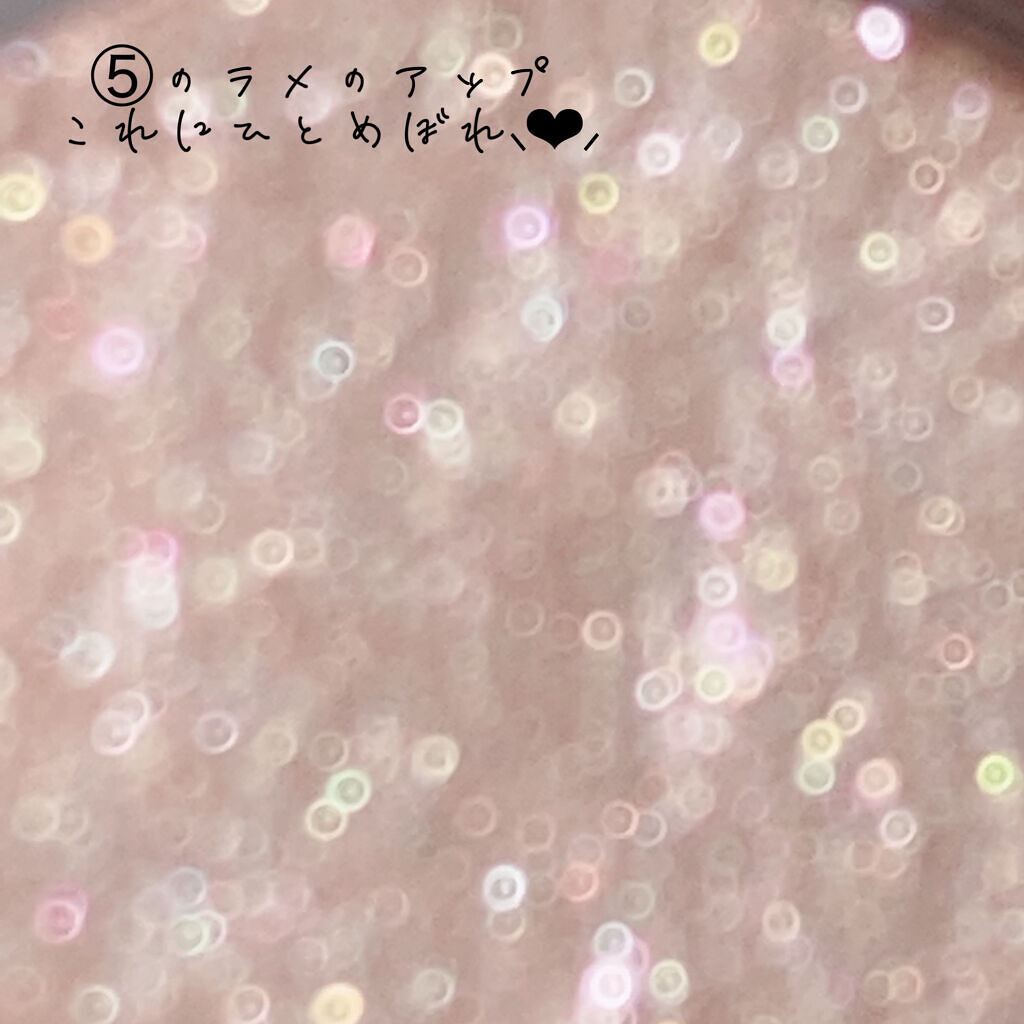 ①いちごミルクのような薄ピンクのカラーは、アイホールに塗るもよし、ハイライトとしても使えます🔆 ②王道ピンクがすごく可愛い🎀 このカラーをメインにアイメイクをすると、目元の印象が優しいガーリーメイクが完成します🍀*゜ ③②よりはオレンジ感を含んだコーラルカラーです❣️ 発色も強めなのでメインカラーにピッタリ!🧡 ④締めカラーにするには若干明るめブラウンですが、ピンクラメが入っていてすごく可愛いです❕ ⑤このラメすごく可愛くて!!! 買う前にスウォッチしてて、このラメで購入決定したほど🌷 カラフルなラメは、まるでtoo facedのハイライトみたい🫶🏻️😖💓