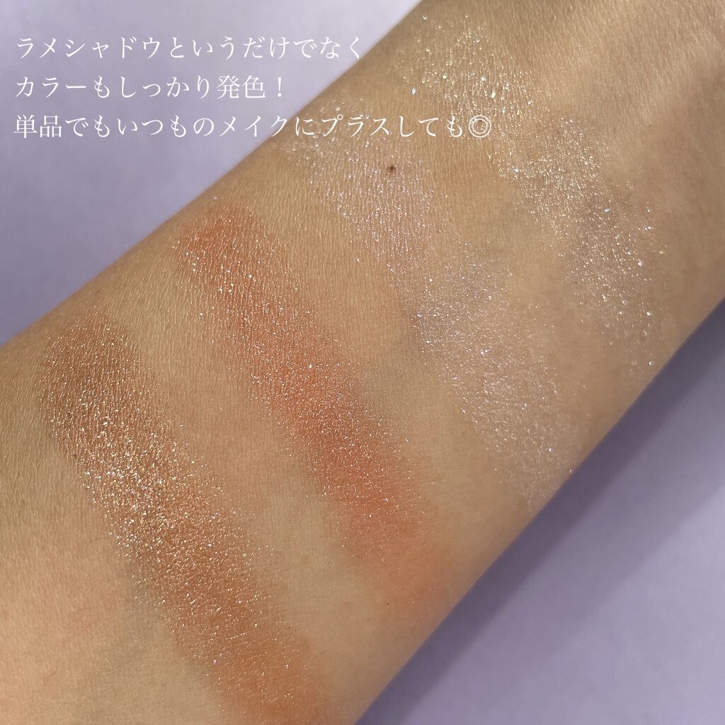 全体的に淡めです! イエベ向きな黄色みのあるブラウン系🤎 シマーなラメが可愛すぎる!! 密着度の高いラメでポンと乗せるだけで キラッキラ✨✨ 粉飛びもしないです! 発色はいいですが淡いので 初心者さんでも使いやすい!!!