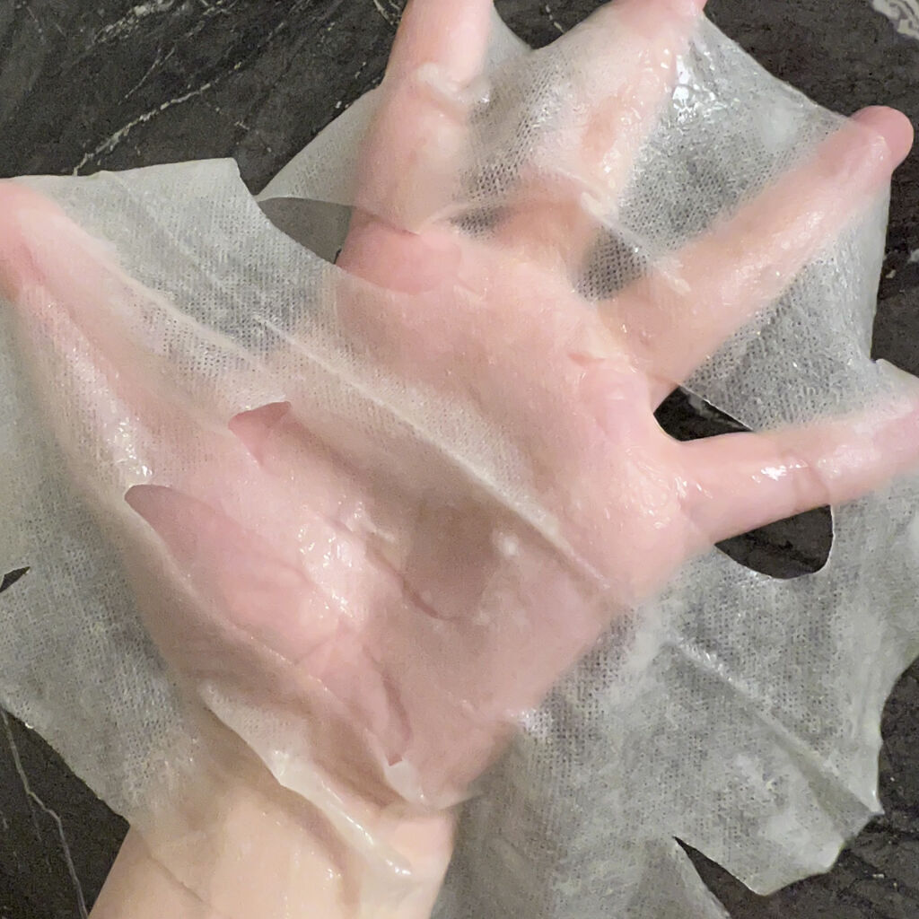 キュレルは言わずもがな乾燥性敏感肌を考えたブランドなので肌のコンディションに波がある私ですがそういうことをあまり考えなくても安心して使えてるので自分には合ってそう。 このマスクの推しポイントはくり抜かれてない目元のシートとどこでもケアシート。どっちも初めてー!ありそうでなかったやつ。 シートは厚みはそこそこあって、かなりぎゅっとしてる。引っ張っても裂けたり伸びたりしない。 いつも顔に使った後に脚とかにのせちゃうんだけど、手脚もたまらなくしっとり。