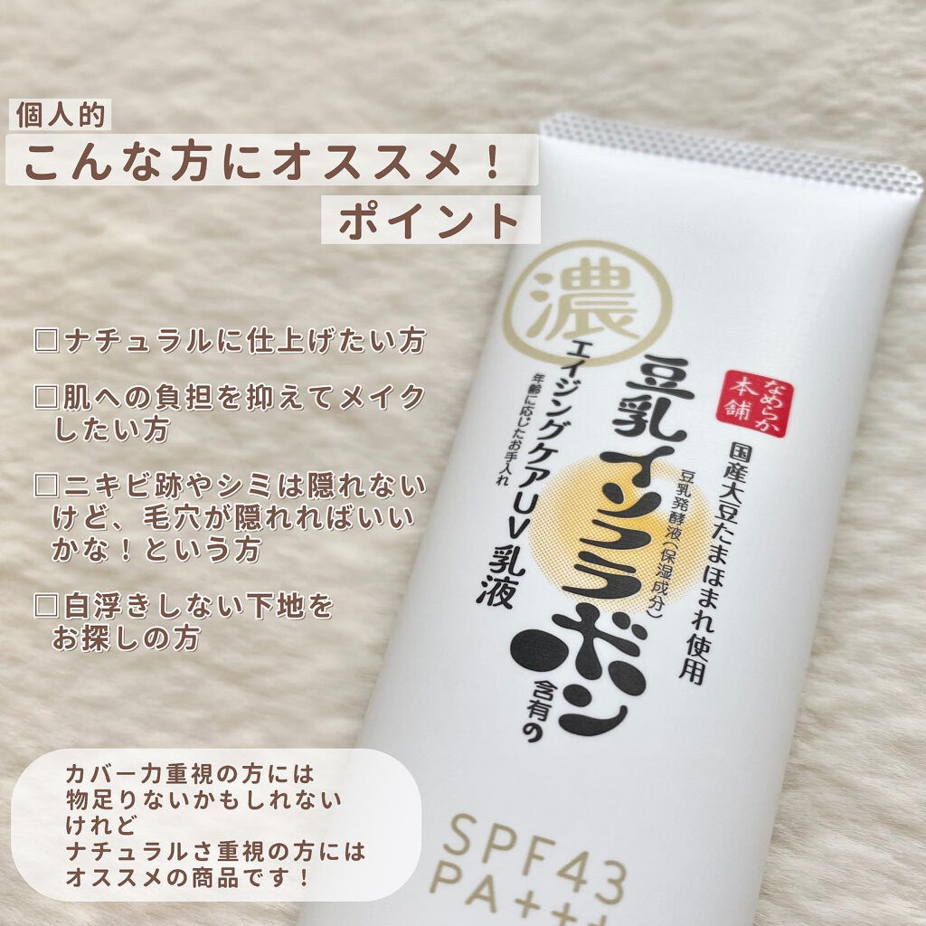 - ほうれい線・小じわのメイクよれが気になる方におすすめの日中用カバーUV 乳液です。リニューアルしたなめらか本舗エイジングケア*1ライン共通の、滋賀県産たまほまれ使用の豆乳発酵液*2とピュアレチノール*2を配合しています。リンクルリフレクト効果で、ほうれい線や小じわを目立たなくし、時間が経ってもメイクよれが気にならない処方を採用しました。お肌にうれしいノンケミカル(紫外線吸収剤不使用)処方で、洗顔後これ 1 つでスキンケアからベースメイクまで完成。 乾燥による小じわを目立たなくします(効能評価試験済み)。 SPF43・PA+++、石けんでオフできます。 *1年齢に応じたお手入れ *2保湿成分