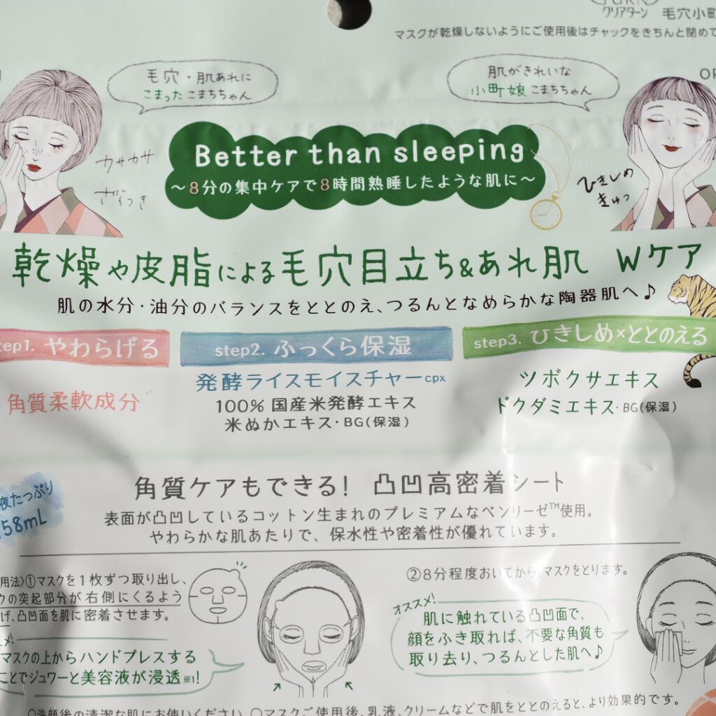 - 毛穴・肌あれが同時にケアできる、毛穴小町マスク! ①毛穴目立ち&肌あれをダブルでケア!なめらか陶器肌へ 水分・油分をバランスよく配合したみずみずしい美容液で、乾燥や皮脂による毛穴目立ちやあれ肌もケアします。キメのととのった、つるんとなめらかな陶器肌に導きます。 角質柔軟成分※3配合。肌をやわらげます。 100%国産米発酵エキス・米ぬかエキス・BG(保湿)をはじめとする発酵ライスモイスチャーCPX配合。ふっくらと保湿します。 ツボクサエキス・ドクダミエキス・BG(保湿)配合。ツボクサエキスは今話題のCICA成分です。肌をひきしめととのえます。 ※3 角質柔軟成分はリンゴ酸 ②角質ケアできる凸凹高密着シート コットン生まれでやわらかな肌触りの国産シートを採用。シートマスクの表面には凸凹のエンボス加工を施しているため、密着性が高く、はがしたマスクでやさしく顔をふきとることで角質ケアもできます。 ③心地よい眠りにみちびくようなリラックスフローラルの香り(天然香料配合) ④やさしい使い心地 弱酸性・無着色・無鉱物油・パラベンフリー・紫外線吸収剤フリー・シリコーンフリーのやさしい使い心地です。