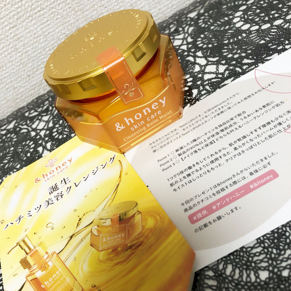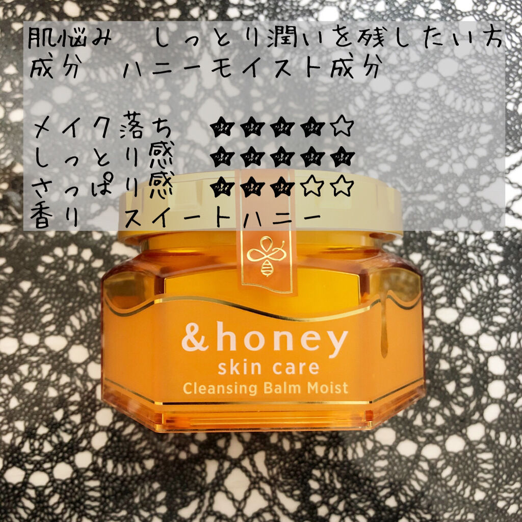 - 『&honey』から初のスキンケアシリーズ、クレンジングが誕生。 肌にうるおいを与えながら落とすハチミツ美容で、製品の90%以上をハチミツやアルガンオイル、オーガニックヒアルロン酸などの保湿&整肌成分で構成。 【クレンジングバーム モイスト】 ・ハニーモイスト成分*を配合 潤いを残しながらメイクをOFF.しっとり肌へ導きます。 ・1つで5役 メイク落とし・角質ケア・洗顔・マッサージ・保湿の5役 ・W洗顔不要。まつエクOK。パッチテスト済み。 ・無添加・フリー処方 合成着色料・パラベン・アルコール・動物実験フリー ・スイートハニーの香り *プロポリスエキス、ハチミツ(全て保湿)
