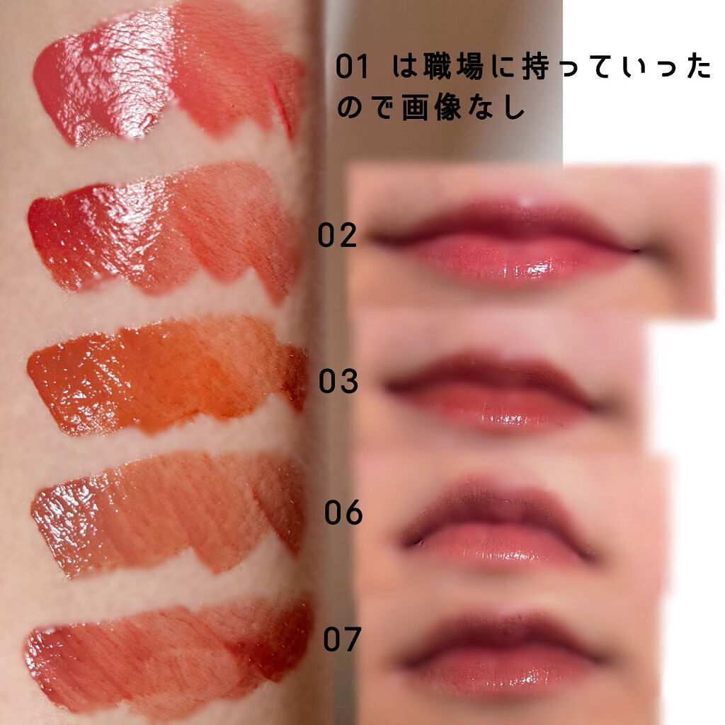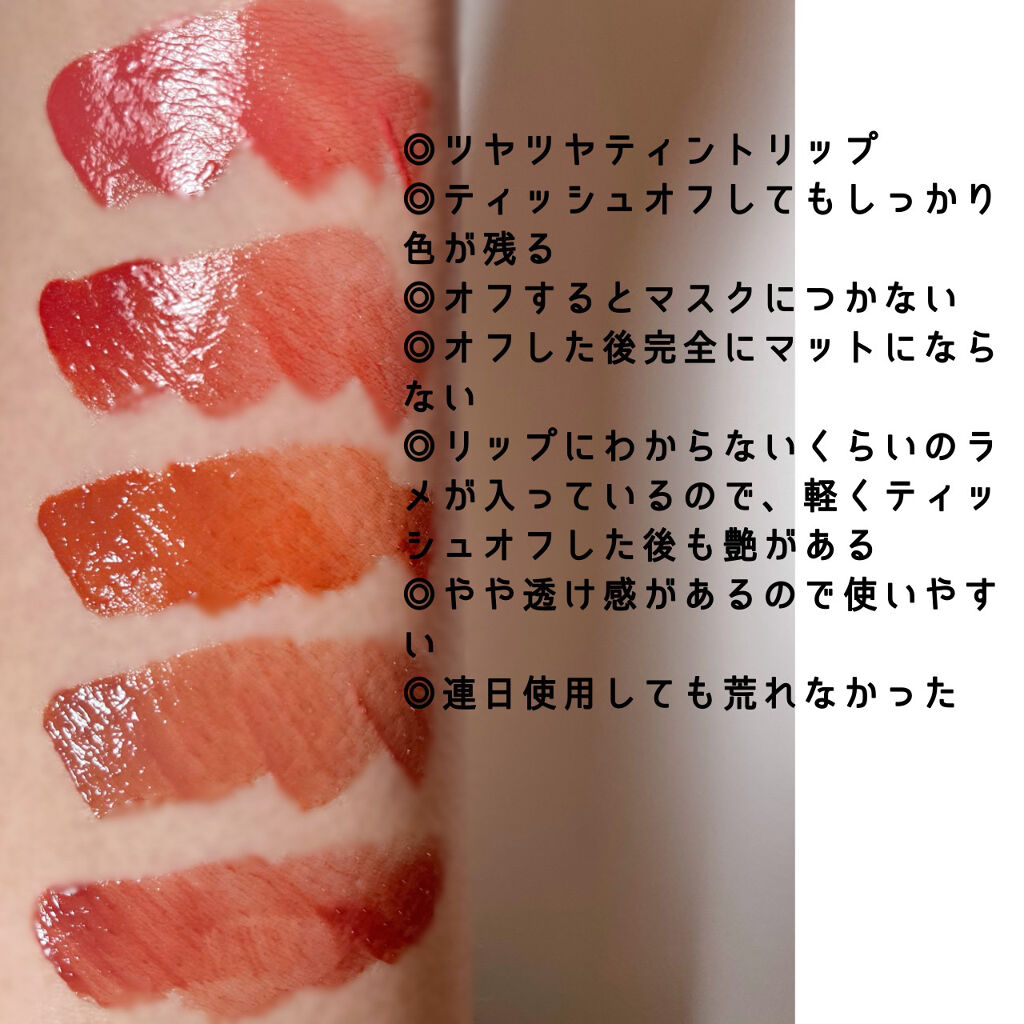 濡れたような艶が長時間持続するティントルージュ オイルinウォーター処方で唇の表面はベタつかず、内側はしっとり潤う仕上がりに 美容保湿成分配合 ◎ツヤツヤティントリップ ◎ティッシュオフしてもしっかり色が残る ◎オフするとマスクにつかない ◎微細なラメが入っているので、オフしても艶がある ◎やや透け感があるので使いやすい ◎荒れない ◎プチプラで手に入れやすい🙆♀️ 昔セザンヌのラスティングリップカラーNで荒れる&シワができたので不安でしたが、こちらは荒れずに使えて非常によかったです◎