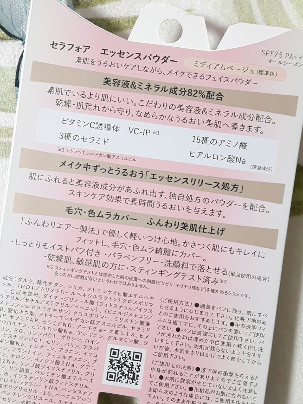 - 素肌をうるおいケアしながら、メイクできるフェイスパウダー。乾燥、肌荒れ、マスクのこすれからも守り、なめらかなうるおい美肌へ導きます。美容液&ミネラル成分82%。ビタミンC誘導体VC-IP※1、15種のアミノ酸、3種のセラミド、ヒアルロン酸Na配合。(保湿成分)メイク中ずっとうるおう「エッセンスリリース処方」。肌にふれると美容液成分があふれ出す、独自処方のパウダーを配合。スキンケア効果で長時間うるおいを与えます。「ふんわりエアー製法」で優しく軽いつけ心地。かさつく肌にもキレイにフィットし、毛穴・色ムラ綺麗にカバー。しっとりモイストパフ付き。パラベンフリー。洗顔料で落とせる(単品使用の場合)※1テトラヘキシルデカン酸アスコルビル SPF25・PA++