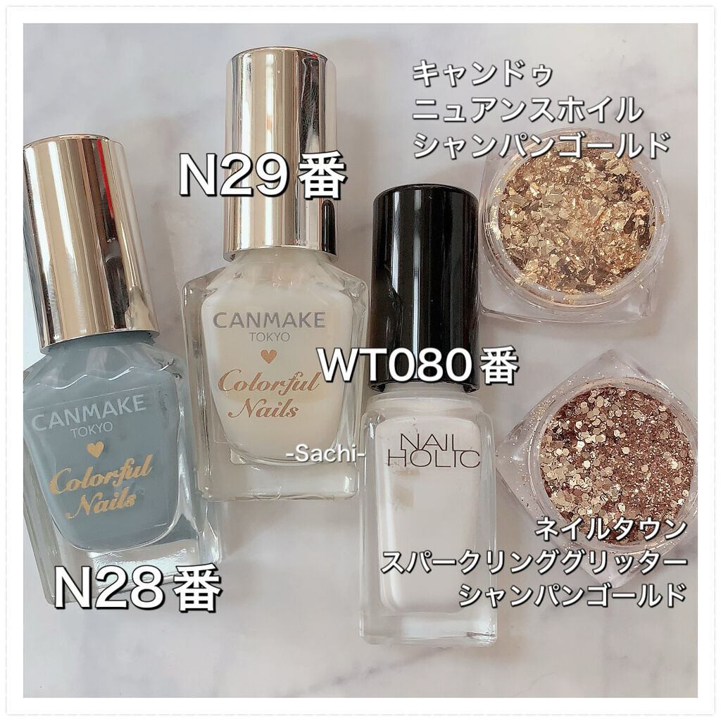 キャンメイクカラフルネイルズ N29ミルクシロップ N82クラウドレススカイ 親指、人差し指、小指は爪先にSV082で細いラインを描き、中指、薬指はAA225を重ねました。 ベースコート、トップコートはネイルホリックのものを使っています。