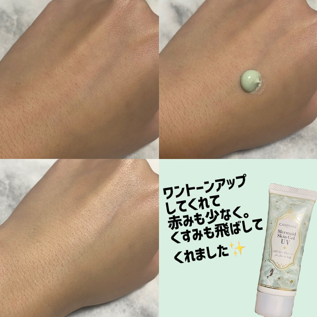 キャンメイク マーメイドスキンジェルUVC01CICAミント赤みやくすみを補正するグリーン下地💚🐚SPF50+PA++++🏖️みずみずしいテクスチャーで伸びが良くて使いやすい❕グリーン系の下地が欲しかったのもあるけどパッケージが可愛くて💕洗顔...