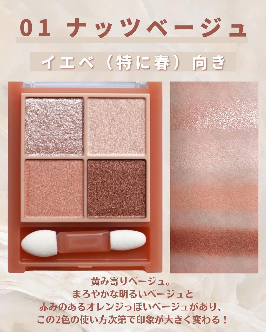 - ラメ・パール・マット3質感の4色アイシャドウ。 肌馴染みの良いベージュを基調としたカラー。ラメ・パール・マットの3質感を重ねて、自然にまぶたを強調し奥行のある大きな目元へ。 しっとり溶け込むような柔らかなパウダーなので、スルスル伸びてまぶたにピタッと密着。保湿成分(スクワラン・ホホバ種子油)配合。