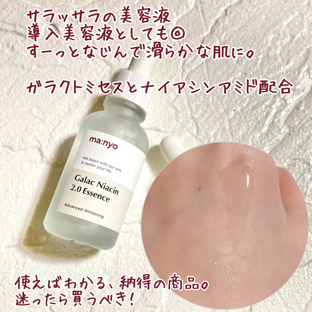 - ビタミン、アミノ酸などの有効成分を豊富に含んだガラクトミセスが93%配合され、皮脂・水分バランスの調節、毛穴ケア、トーンアップケアをサポート。ナイアシンアミド4%配合でメラニンの生成を防ぐ濃縮美容液です。水のような軽いテクスチャーでべたつきません。愛用者からは「2週間で肌の変化を実感した」との声が多く届いています。