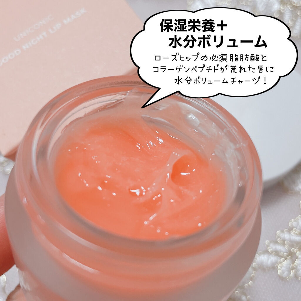 しっかり保湿される ユニコーングッドナイトリップマスク ローズヒップ&コラーゲンは唇をふっくらさせたい時やしわが気になる時に向いているみたいです👌 LIPSに載っている価格より高くなっているっぽいです💦 2145円(税込)と載っています