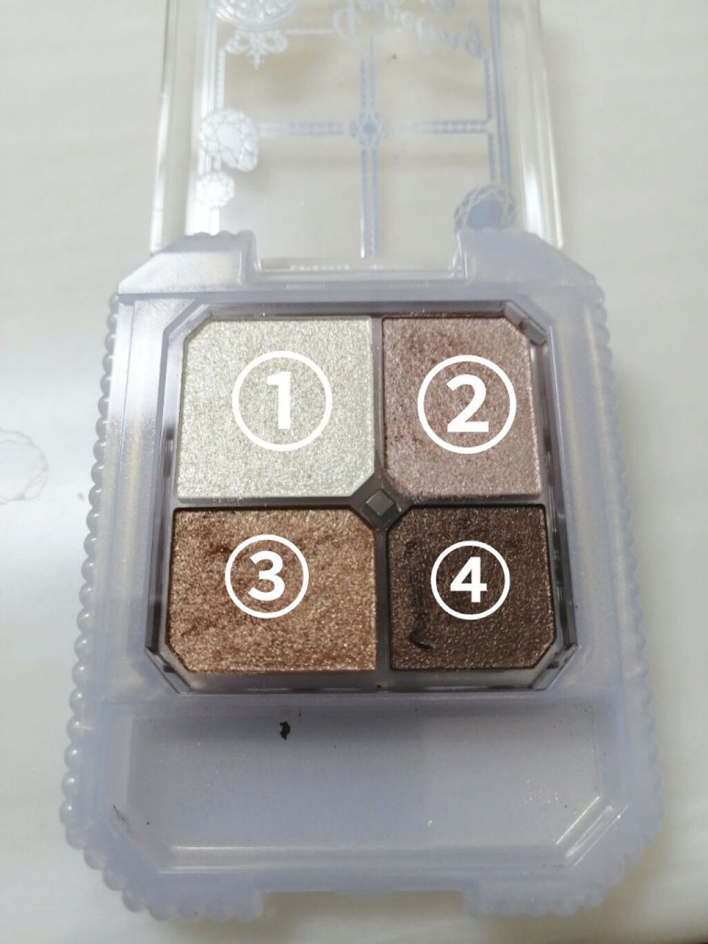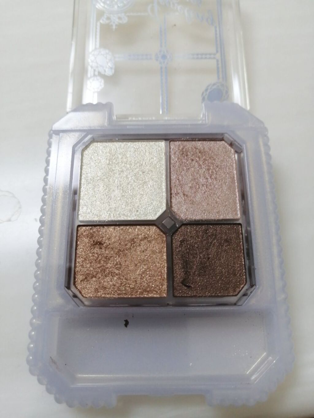 - 輝き感の異なる4色のグラデーション。ちりばめられたクリアな大小パールが角度によって驚くほど輝き、まばたきなどで動くたびにキラキラ。まぶたが多面体の宝石のようなきらめきを放ちます。