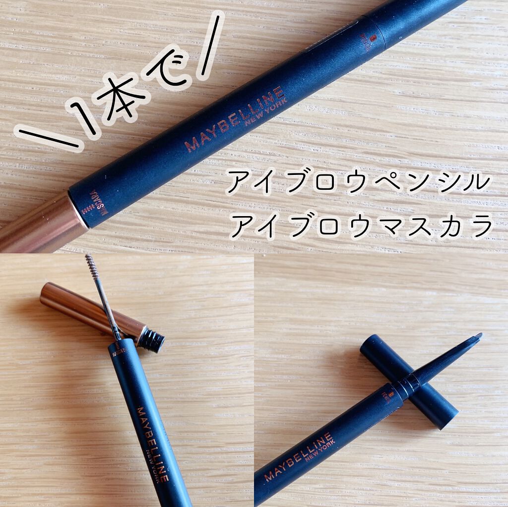 メイベリンのアイブロウペンシルとアイブロウマスカラが1本にまとまった便利なアイテム。 ほどほど細めの三角芯が描きやすいしアイブロウマスカラも細くて塗りやすく落ちにくい。 ただ、どっちを早く使い切るか…が問題。