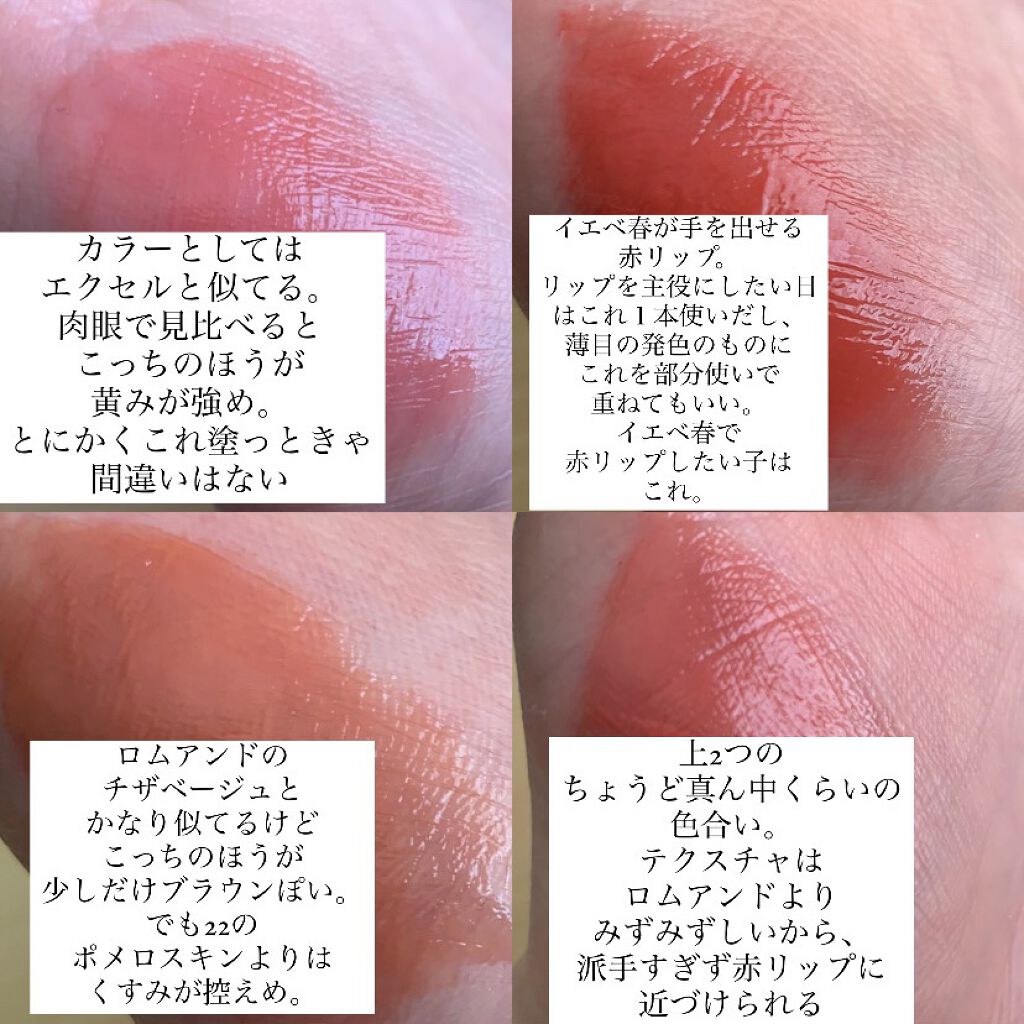 | 口紅・グロス・リップライナーランキング第100位 | 潤いが長続きします! 透け色ですが、重ねればパキッと仕上がるので調整しやすいティントだと思います!! | 詳細を見る |