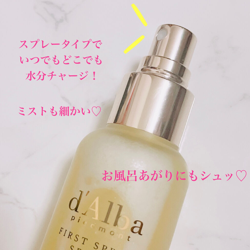 - イタリア産ホワイトトリュフ*と植物性オイルで豊かな水分を与えツヤ肌に仕上げる保湿ケアミストです。肌表面の保湿だけでなく、内側までしっかり二重で保湿可能。さらにダルバ独自のトリュフェロールTMが肌に弾力を与えます。霧のような細かなミストで洗顔後やお風呂上り以外のメイクの上からでもメイクを邪魔することなく使用することができます。 *ツベルマグナツムエキス(保湿成分) イタリアヴィーガン認証V-LABEL取得 皮膚低刺激テスト済み *全ての方に皮膚刺激が発生しないということではありません。 【ご使用方法】 1. 洗顔後、3~5回振って中身が十分に混ざった後、顔全体にまんべんなく噴射して軽くたたいて肌に馴染ませます。 * 鼻や口から吸い込まないように注意してください。 【使用上の注意】 お肌に異常が生じていないかよく注意して使用してください。化粧品がお肌に合わないとき即ち次のような場合には、使用を中止してください。そのまま使用を続けますと、症状を悪化させることがありますので、皮ふ科専門医等にご相談されることをおすすめします。 (1)使用中、赤味、はれ、かゆみ、刺激、色抜け(白斑等)や黒ずみ等の異常があらわれた場合 (2)使用したお肌に、直射日光があたって(1)のような異常があらわれた場合