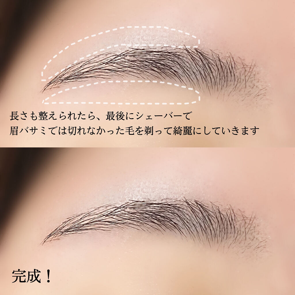 私は主に眉バサミを多く使っています! 画像にも記載した通り、毛が太いと、一本ある・無いが結構目立ちます。 剃りすぎるとそこだけハゲて目立ってしまいます😖 なので眉バサミで細かく整えてから、シェーバーで仕上げをする感じです◎ 毛を一本一本切るときは、ハサミの刃の先端だけで切ると他の毛を巻き込まずに切ることができます! 眉頭の付近は濃くなりやすいので、この方法で少し量を減らしたりしています♫ 毛の長さも全体的に長い分、切り過ぎるとそこだけツンっとなって目立つ場合があります。 私は個人的に立体感を残しておきたいので、長さもある程度残してますがお好みで◎ 正面から見て大丈夫でも、別の角度から見るとぴょんっと長い毛が出てることもあるので、いろんな角度から眉毛を見てみると、一本一本の長さが分かりやすくておすすめです🐇♡