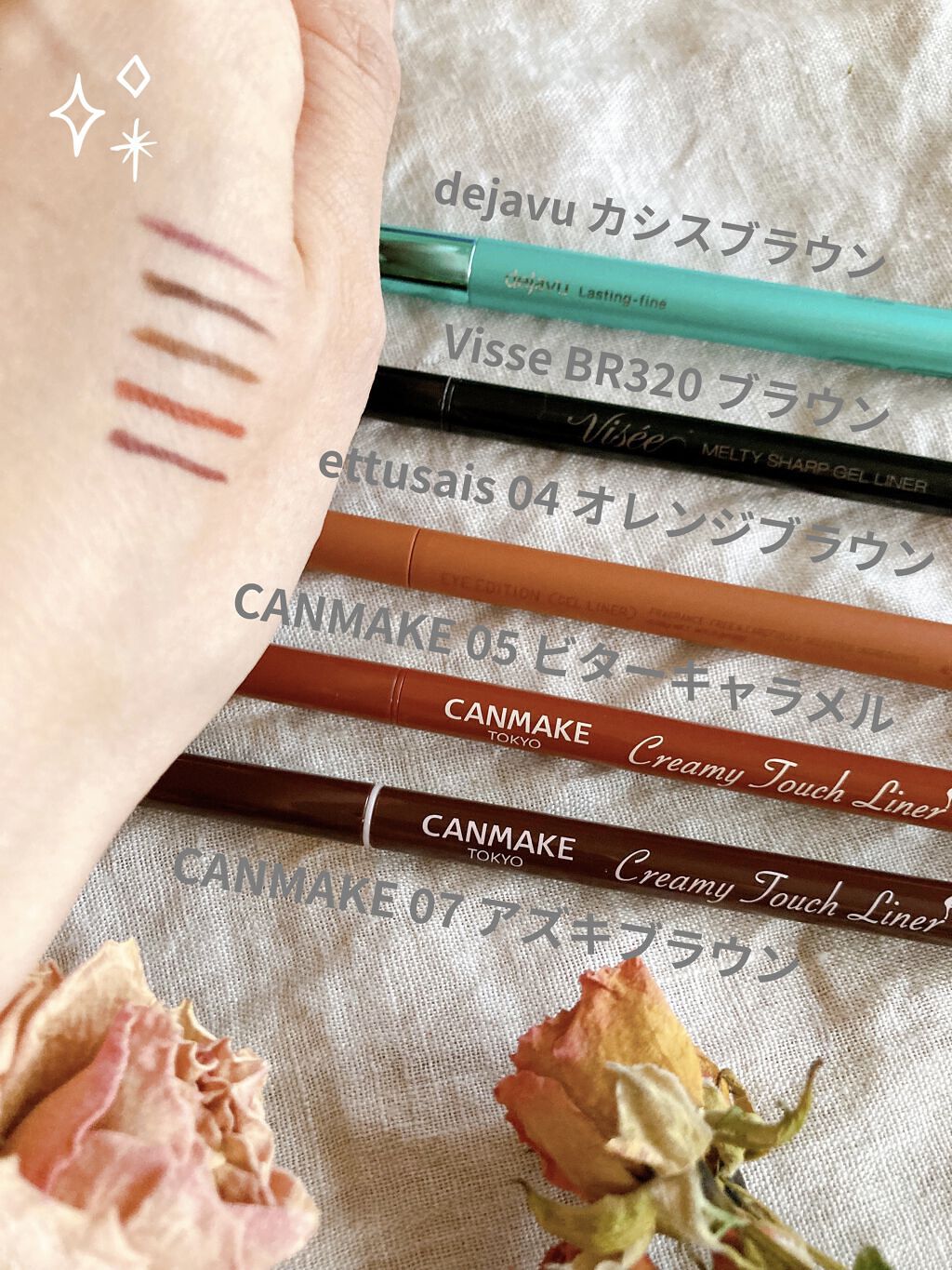 ettusaisもCANMAKEも柔らかくて、するするかけて、ぽろぽろしなくて、崩れにくくて、クレンジングで落ちやすくてお気に入りです🌼 イエベで浮かないかなぁーと思う色を購入しているので、全色ではありません👀 1,2枚目☞ettusaisアイエディション ジェルライナー4番はリピ2本目♡どれも好きだけど、3, 4, 9番をよく使ってます見た目もシンプルマットでお気に入りです♪ 3,4枚目☞CANMAKEクリーミータッチライナーこちらも、どれも好き♡特に7,9,10番をよく使ってます どちらもかわいいけど、オフィスとかで使いやすそうな落ち着いた色味はettusaisでお休みのおでかけではっきりしたカラフルな色を使いたいときはCANMAKEなイメージです 5,6,7枚目☞ettusaisとCANMAKEの似た色集めてみました☆CANMAKEの10番ココアグレージュとettusaisの09番ヘーゼルチャイ似すぎwwここまでくると違いがよくわかりません🤣CANMAKEの10番買えなかった人はettusaisの09番オススメです