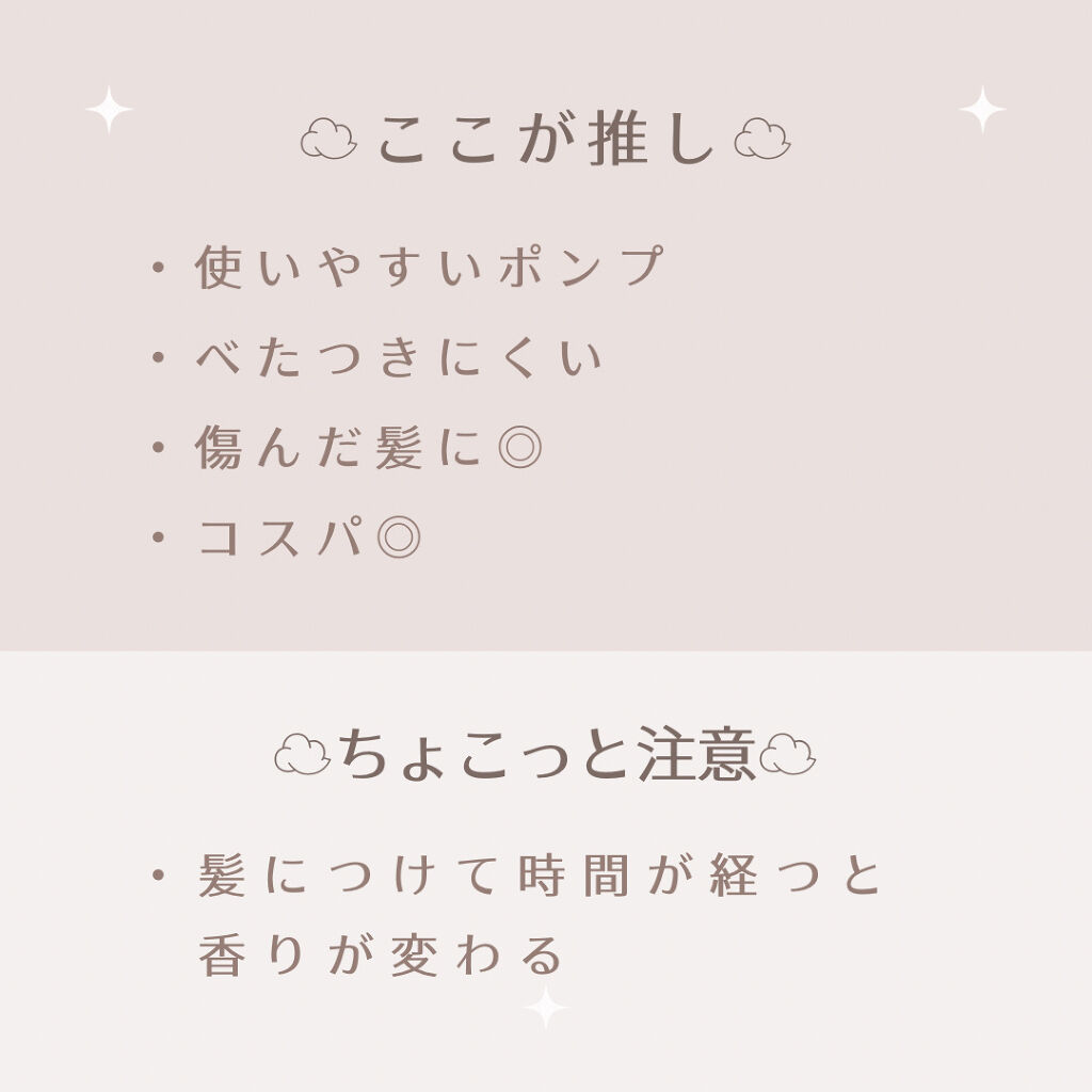 | ヘアケア・スタイリングランキング第96位 | 髪の毛がまとまりやすく、扱いやすくなった感じがして嬉しい🥰 べたつかないさらっと軽やかな使い心地で、手もべたつないから終始快適 | 詳細を見る | |