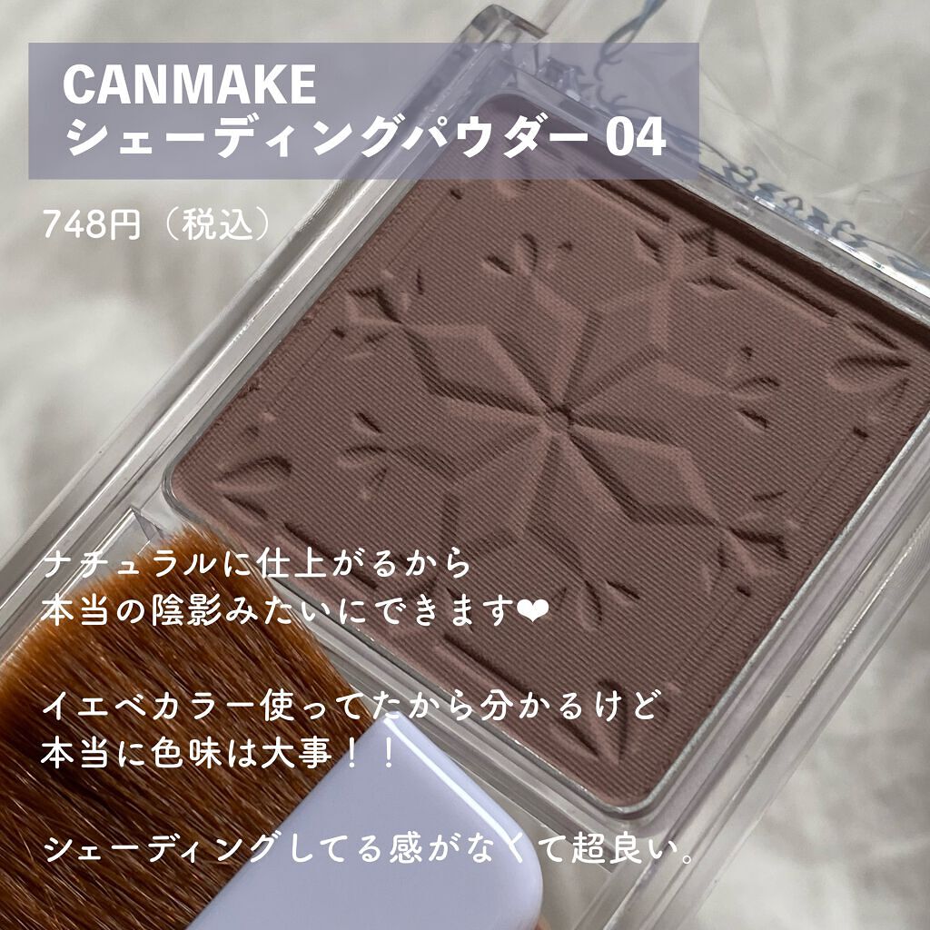 何度もリピしているキャンメイクのシェーディングパウダー🤎 どんどんパケも可愛くなってブラシも使いやすくなってカラバリも豊富にあるのでずっと愛用しています😇🫶 04のアイスグレーブラウンはブルベ向きのお色🩵ですが個人的にはイエベさんでもそこまで浮くことのないようなお色かと思います😌 自然な陰影がだせる平ブラシ付で これまたこちらもふわふわで使いやすく持ち運びにも便利です🤲🥰