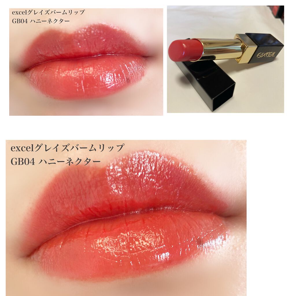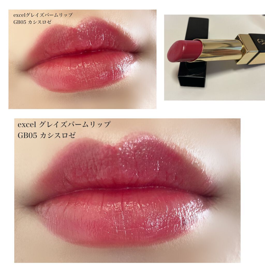 excelのリップの中でも1番お気に入りのグレイズバームリップ✨ するする塗れて色むらなしの色落ちもキレイなので塗り直しもキレイに直せるのが好き🥰 手首と唇のスウォッチがあるので参考にどうぞ❤️