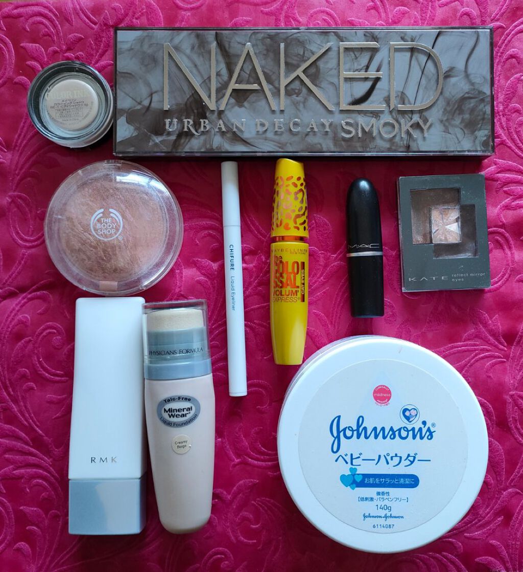 アリィー ニュアンスチェンジUV ジェル RSを、顔全体にまんべんなく塗ります。 RMK RMK ジェルクリーミィファンデーション 103を、顔全体にまんべんなく塗ります。 ジョンソンベビー ジョンソン ベビーパウダーを、顔全体にまんべんなく軽くはたきます。 THE BODY SHOP bronze shade warm glowを、両頬に塗ります。 KATE リフレクトミラーアイズ BR-1の締め色を、眉毛全体にまんべんなく塗ります。 URGLAM UR GLAMBLOOMING EYE COLOR PALETTE 01を、使用しました。 ちふれ リキッド アイライナー 筆ペンタイプ BK30 ブラックを、塗ります。 CEZANNE エアリーカールマスカラを、まつ毛全体にまんべんなく塗ります。 MAYBELLINE NEW YORK コロッサルボリュームエクスプレスを、まつ毛全体にまんべんなく塗ります。 MAYBELLINE NEW YORK SPステイ マットインク 135を、唇全体にまんべんなく塗ります。
