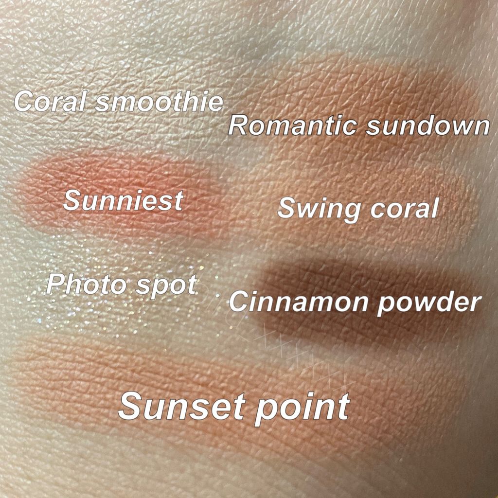 アイシャドウ6色とチーク1色構成のパレットですが、03 Sand Paletteはブラウンパレットなので、他にもアイブロウやアイライナー、シェーディングなど、マルチに使えます。 カラーは黄みのあるブラウン、赤みのあるブラウン、グレーみのあるブラウンなど、どなたにも使えそうなカラーが揃っています。 中でも私が一番好きなテクスチャーが⑤のシマーなのですが、こういうパール感のあるものが一つでも入っていると華やかになって嬉しいです。 パウダーは、マットでもしっとりしていて、まぶたに乗せる時に粉飛びをすることはありません。発色も密着度もとても良かったです。 私のパーソナルカラーがブライト春夏で彩度も明度も高めが良いとのことなので、このパレットは私には少しトーンが濃かったんですが、たまにはこういう濃いめのカラーも楽しいなと思いました。 今年のラッキーカラーがブラウンで、ブラウンのアイシャドウをすると良いそうなので、ブラウンカラーにもっとチャレンジしてみたいです。