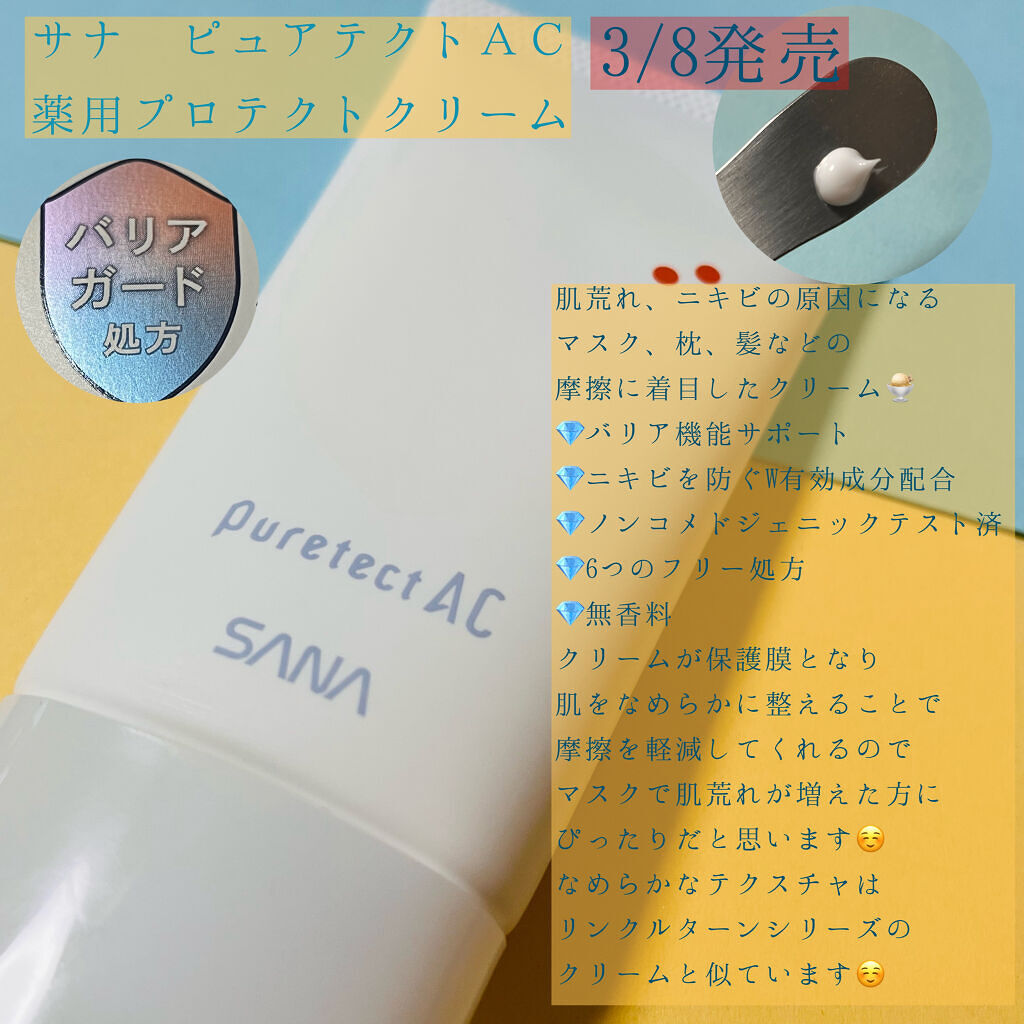 摩擦を減らす🤍\サナ ピュアテクトAC 薬用プロテクトクリーム 40g/1,210円(税込)マスクしてるとほんとに肌荒れします😭いや、、マスク生活じゃなくてもよく肌荒れしてるんですけど😅😅特に不織布マスクを長時間して外すと、ちょうど...