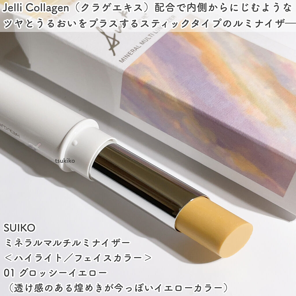- Jelli Collagen®※1配合で内側からにじむようなツヤとうるおいを与える、スティックタイプのルミナイザ―。 ハイライトやリップとしてはもちろん、マルチカラーと重ねて質感をグロッシーにチェンジする事もできます。 ミネラルと天然由来100%のルミナイザーです。 ※1クラゲエキス(保湿成分)