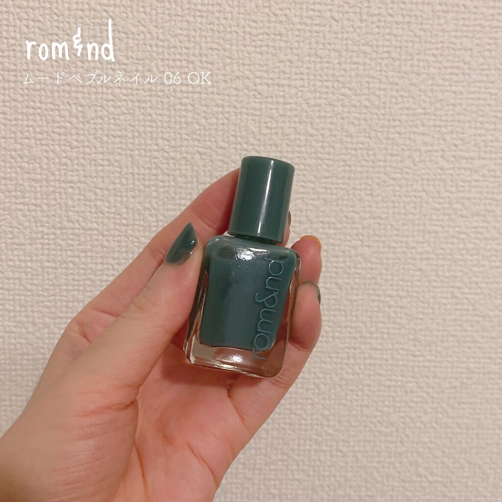- 指先に玉石のような、ならかな光沢をとどめる。塗った瞬間から綺麗なツヤと光沢を維持し、重ねて塗っても透き通ったカラー感を鮮やかにとどめる、素早い乾燥力のナチュラルカラーネイル。「ロムアンド」の次世代型ネイルです。