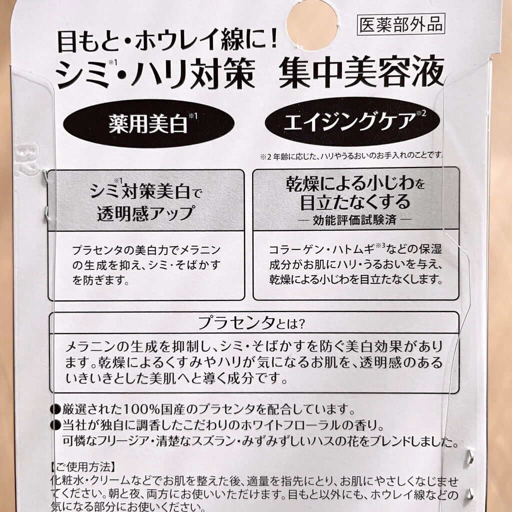 - 【医薬部外品】 ※2024年3月〜パッケージ・価格をリニューアル。尚これにかかる商品の返品・交換は承っておりません。 ■目もと・口周りに。薬用美白*1+エイジングケア*2、塗るだけWの集中美容液。 ■有効成分プラセンタ配合でメラニンの生成を抑え、シミを防いで、透明感あふれるお肌へと導きます。厳選された国産のプラセンタを配合しています。 ■コラーゲン(ハリを与える成分)・ハトムギ(保湿成分)などの成分がお肌にハリ・うるおいを与え、乾燥による小じわを目立たなくします。«効能評価試験済» *1メラニンの生成を抑え、シミ・そばかすを防ぐことです *2年齢に応じた、ハリやうるおいのお手入れのことです