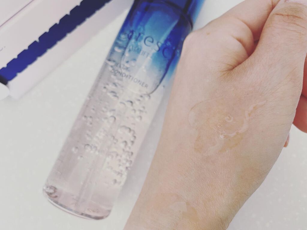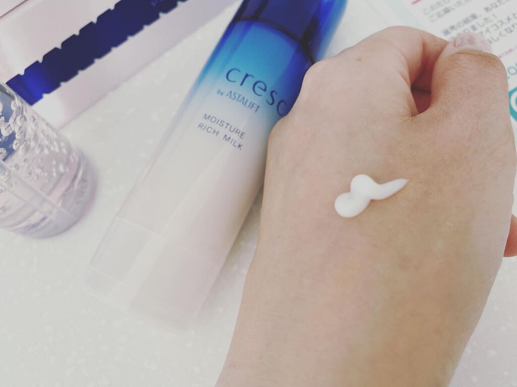 クレスク by アスタリフトは、2022年3月に富士フイルムから誕生したばかりの乾燥・敏感肌向けスキンケアブランド。 ジェリーコンディショナーは、洗顔後すぐに使うジェリー状化粧液。 ヒト型ナノアシルセラミドとチャ葉エキス配合で、肌を整えてうるおいで満たすそう。 みずみずしいジェリー状のテクスチャーが、肌に乗せるとまろやかな化粧水のようになる。 なじみも良く、スッと浸透してべたつきを感じない。 肌はしっとりとして、うるおいたっぷりな感触💛 刺激もなくて、優しく使えそう。 このジェリーコンディショナーの後、クリーム状ミルク「モイスチュアリッチミルク」の2ステップでスキンケアが完了。 手軽に保湿ケアできるのは良い☺