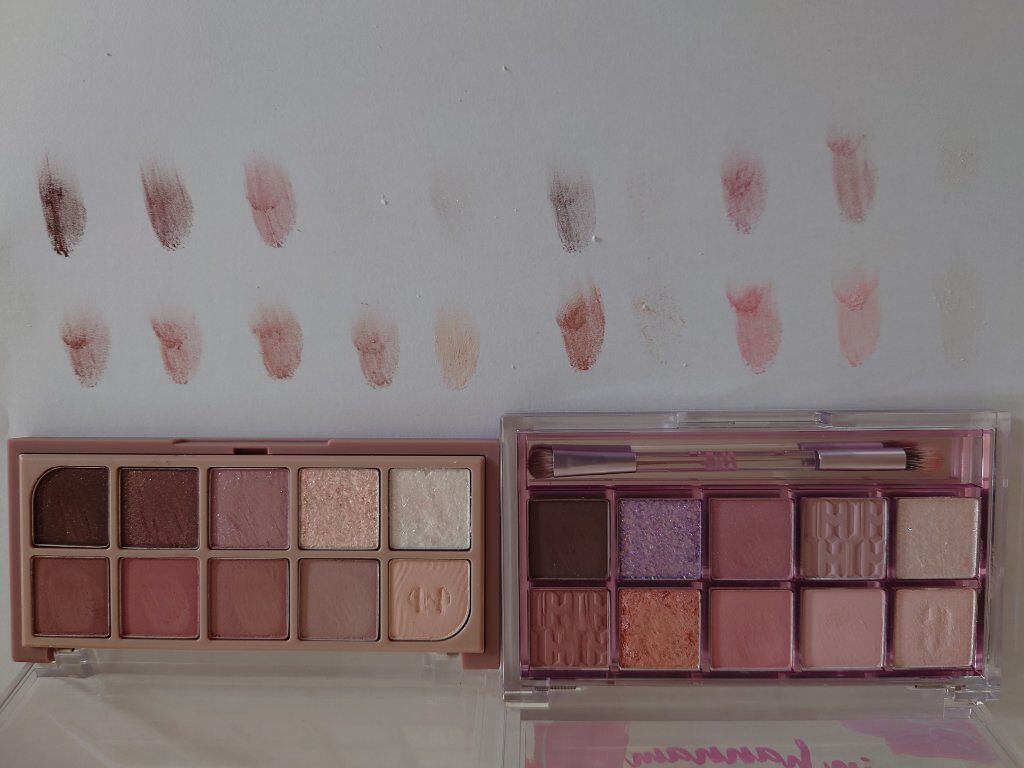 どのパレットも美しくつけたときの発色、仕上がりが全然違うので、購入してよかったです。 クリオは鮮やかで明るい、mudeはグレーが入っていて落ちついた仕上がりになる クリオはラメが少し固いがしっかりついて、落ちにくい。mudeはラメがかなり柔らかく少し落ちる。ミュード02の左下のラメがピンクが入っていてきれい。どちらもラメがかなりきれい。どちらもしっとりとしたマット。 どちらもしっとりしっかりとつく クリオは鮮やかに発色。mudeは深みのある少し暗めの発色。色持ちはミュードのほうがいいと思いました。夕方まで化粧直ししなくてもしっかりついてます。 クリオは色持ちもよく、14は爽やかで、紫の涼しい目元で今風な感じになる。15も透明感が出て肌がきれいに見えます。 mudeの02は深みのあるローズのような色に発色しました。落ち着いた仕上がりです。 クリオは締め色が少し落ちやすいと思いました。ミュードも締め色が濃いので、薄く細くつけないと濃い顔になってしまいます。