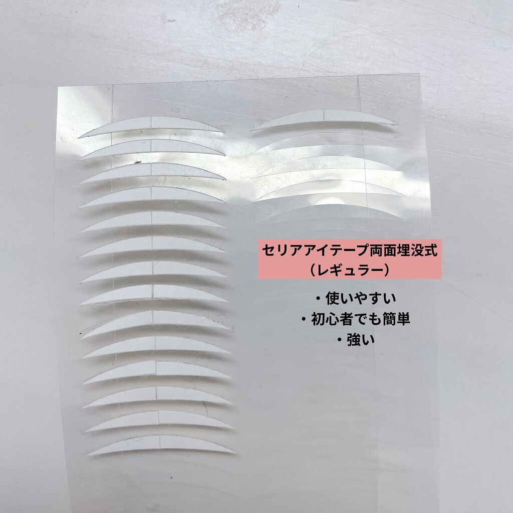 両面アイテープは1番二重を簡単に作れると思います。 おすすめはABの両面アイテープか,ダイソーの両面アイテープ(ポイント)です。 今度ダイソーの両面アイテープのレギュラーを買ってみようと思います。 伸びるタイプのアイテープは不器用な私には不向きだったみたい、、。ちょっと難易度が高すぎました😂
