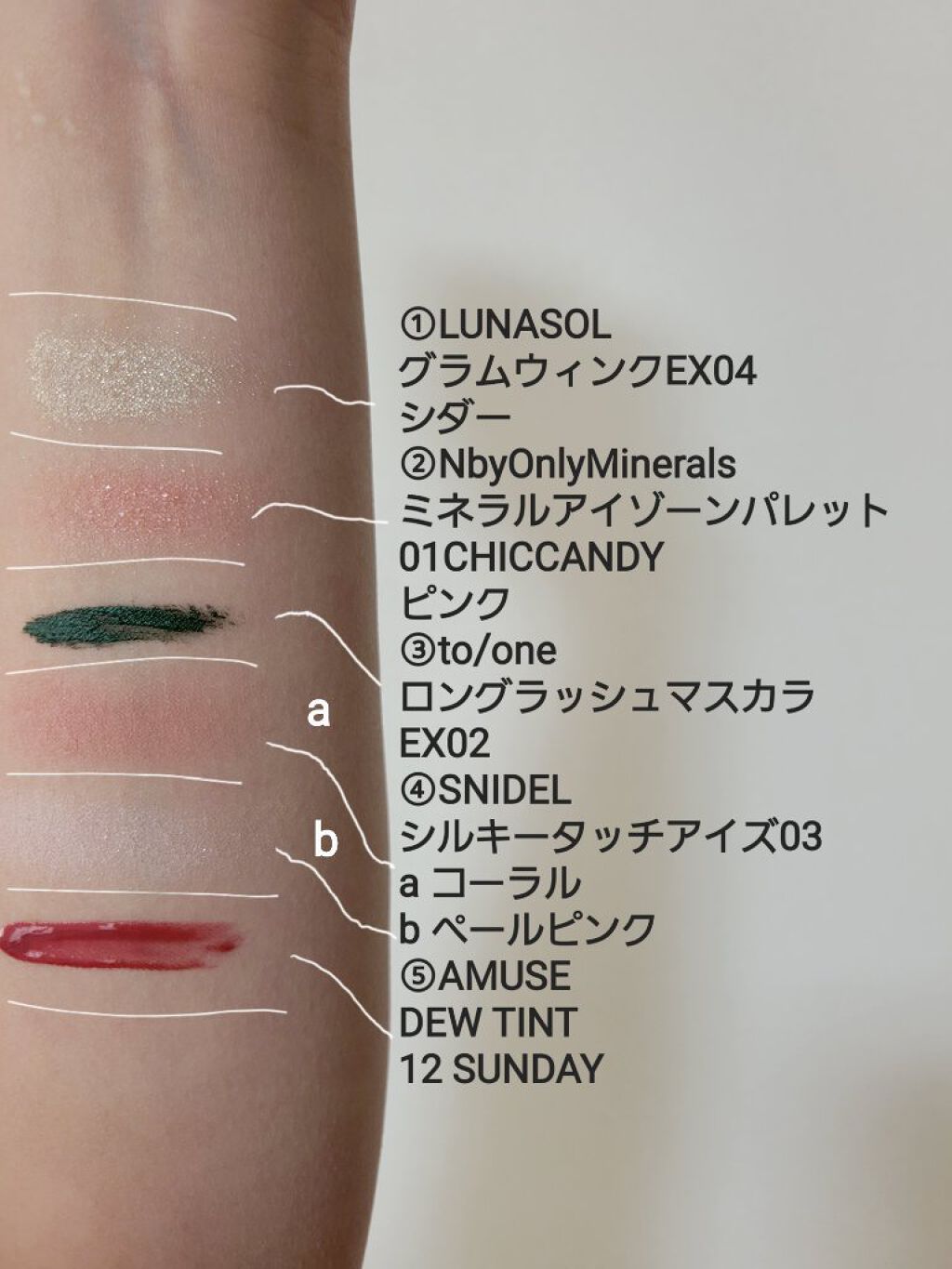 アイブロウは#whomeeのレッドブラウンを使用。 アイメイクは①#アンドビーの#クリームアイシャドウ マスタードを上下の瞼に。 アイメイクは②#misshaの#グリッタープリズムシャドウマーブル #ストームプリズムを①に重ねて。 下瞼は全体ではなく、黒目下にだけ✨ アイメイクは③#hinceの#ニューアンビエンスカラーアイライナー #エクレクティックを4枚目のように三角形に入れる。 チークは⑤#bisouの#ダイヤモンドグロウ マーズをほんのり✨ リップは⑥①のマスタードを塗った後に#celvokeの#エンスロールマットリップス 03を💋