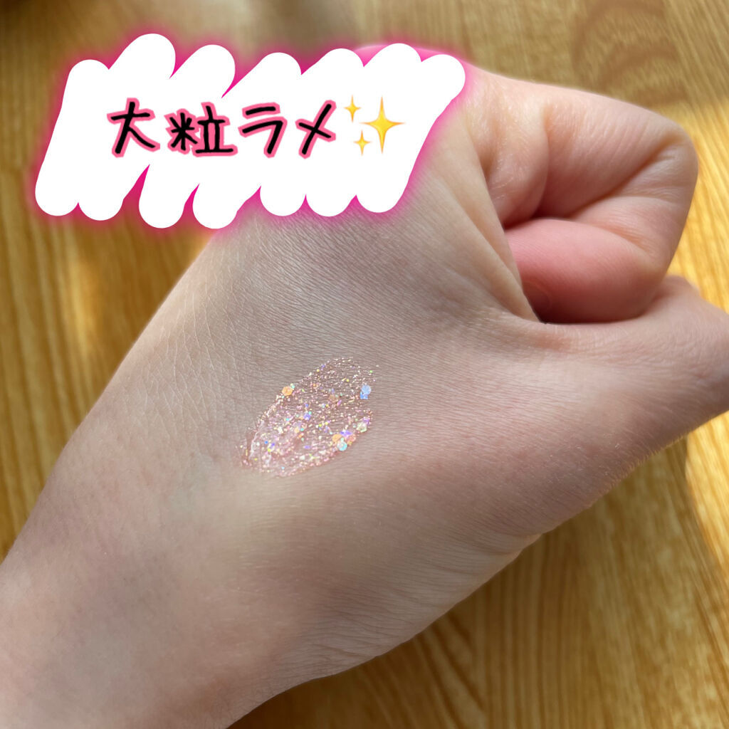 細かいラメと大きめのホログラムが混じっています꒰ˆ•ﻌ•ˆ꒱ 瞬きする度にキラキラしてかわいいです。 よく見ると色々なカラーのラメでてきていますがつけると自然ですฅʕ •ﻌ• ʔฅ