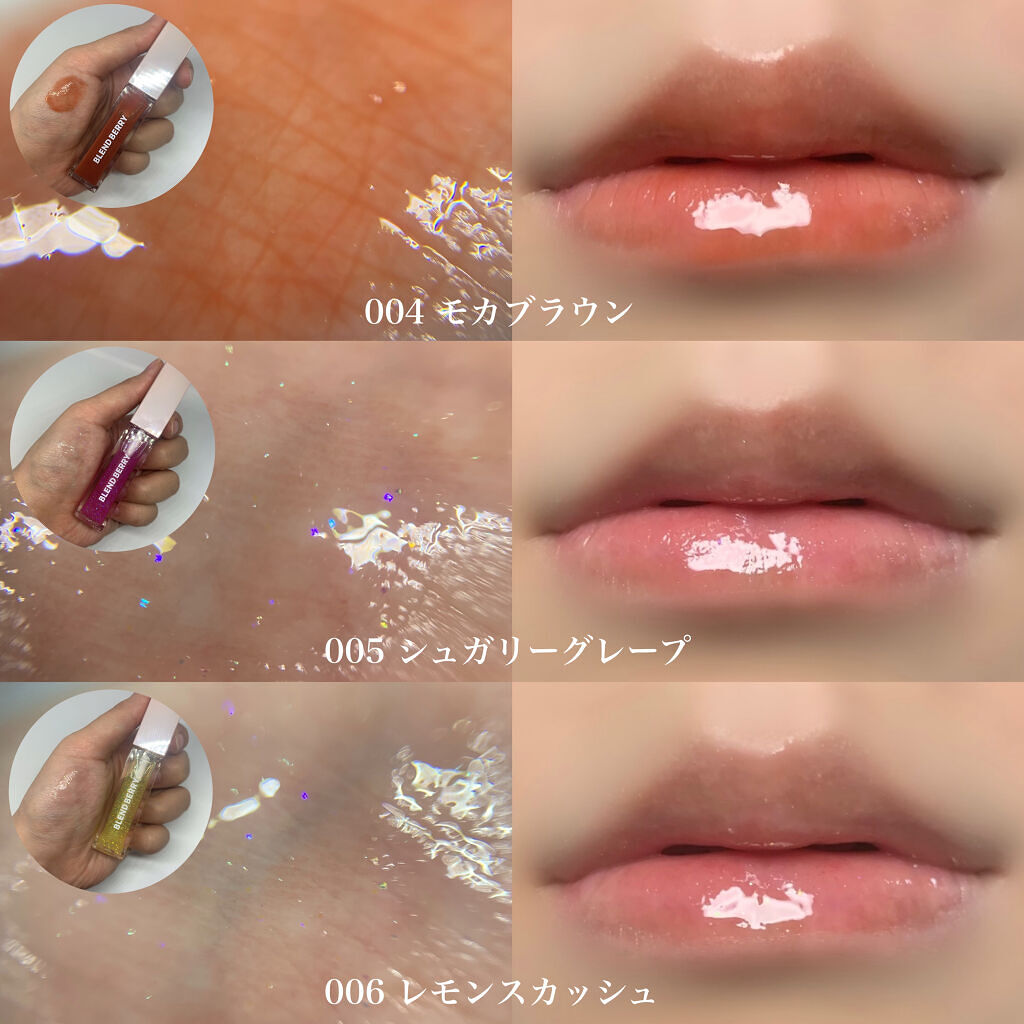 ジューシーな水感🍓新作シロップリップ全色レビュー! 001〜004はシアータイプ、005,006はラメ入りグリタリータイプです。 🍓001 ストロベリーレッド 赤リップ初心者でも使いやすい、シアーなレッド。 🍒002 ブラックチェリー 青みの強いピンクレッドです。 🍑003 キャンディピーチ 儚いお人形さんみたいな唇になれるカラー。 ☕004 モカブラウン 一見使いにくそうに見えて、実際はマイルドでとてもかわいいブラウン。 🍇005 シュガリーグレープ 液は唇にのせるとクリアに発色。 🍋006 レモンスカッシュ こちらもクリア発色で、005番と似ています。 全部に共通して、ベリーの香りがついています🍓 テクスチャーはさらっとしていてべたつきにくく、マスクの下でもリップケア感覚で使えます。 ただ、ティントではないので色持ちは強くはないです。リップケアもできるグロスとして使うのに適しているかなと思います。