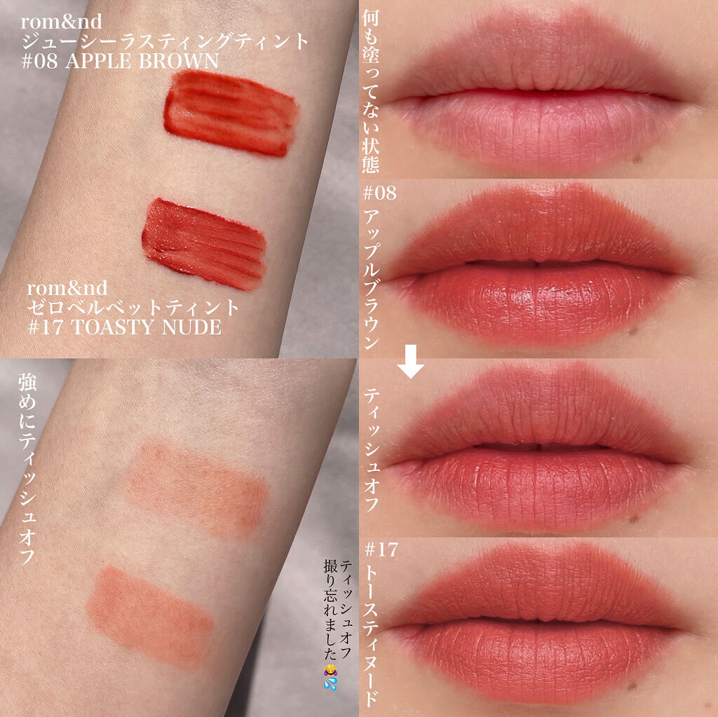 \良く似てると言われるカラーを徹底比較/🌸比較コスメ🌸▶︎RICAFROSHジューシーリブティント(税込1,848円) 01オランジェット 06ルーブラウン▶︎rom&ndジューシーラスティングティント(税込1,320円) #13EATDOT...