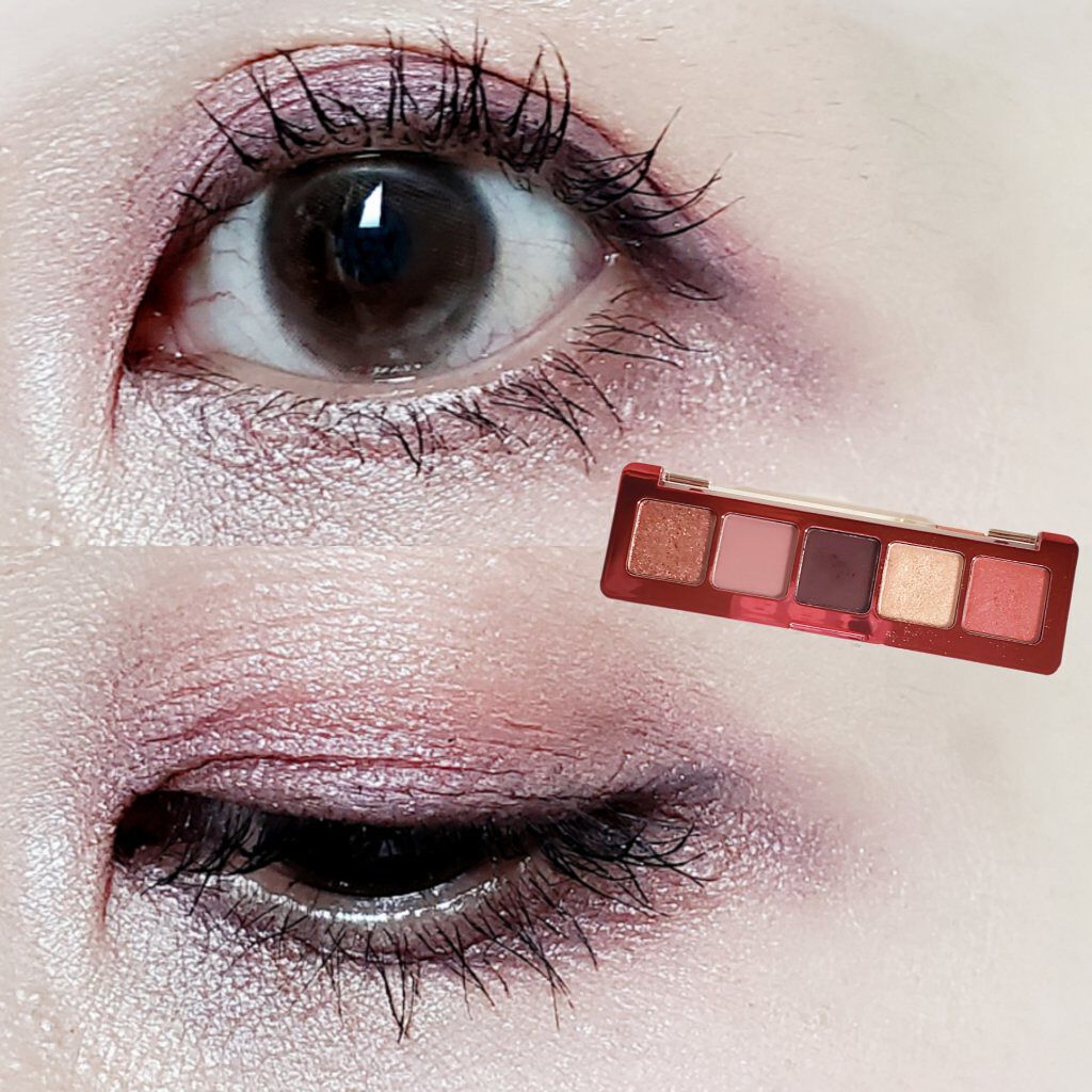 なんとなくだけど左側がブルベ寄り、右側がイエベ寄りの色味でニュートラルなパレットかなと思いました。 目元写真みると発色薄く見えるかなとおもいますが朝メイクして、直さず夜に撮ったのでこんな感じです。 カラコンはmimucoのブラウンフォンデュミムコのカラコンはどれも自然でかわいいです。