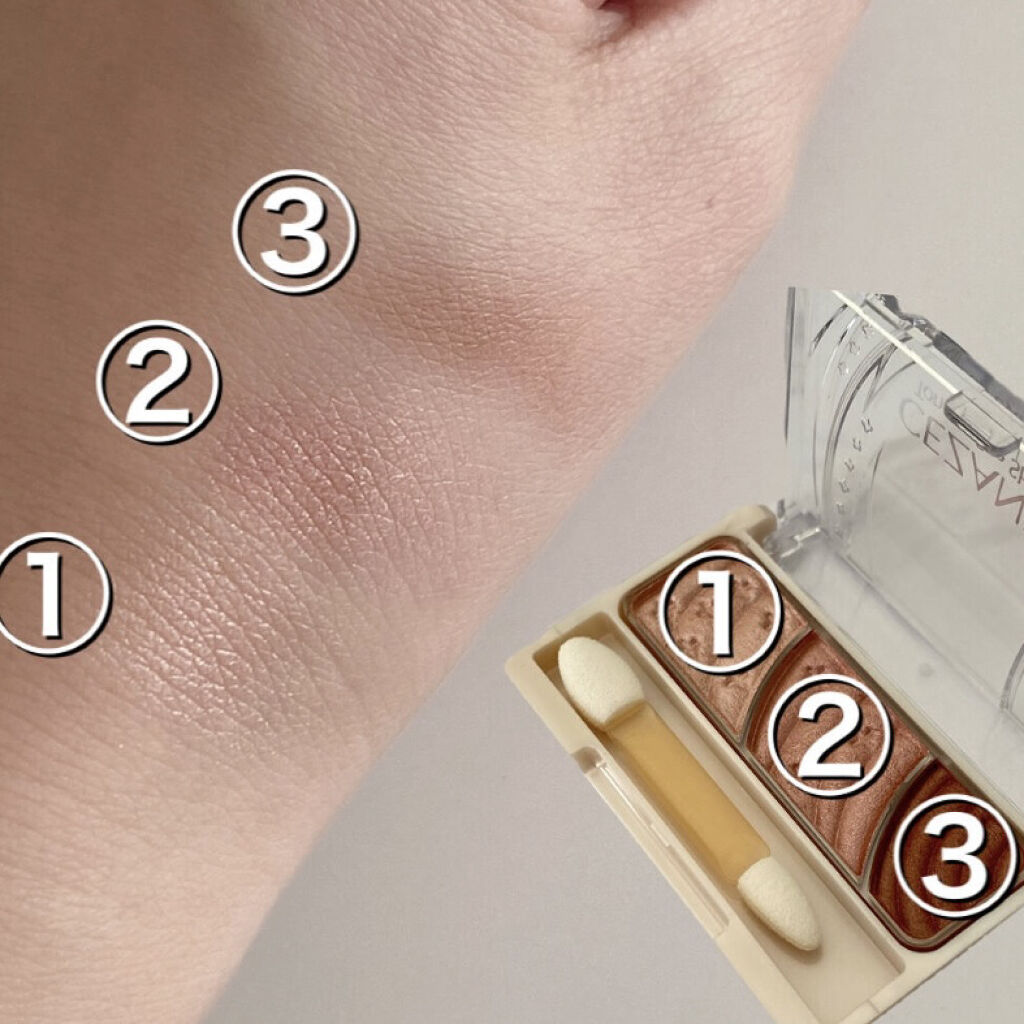 - 3色で簡単に明るく大きな目元に。 しっとり感触のアイシャドウ。 くすみを飛ばす明るさベース、ひとえ・奥二重の方でも幅広く塗れる肌なじみの良い中間色、 濃密高発色の締め色が目の輪郭を強調し大きな目元に。 微細パール配合でくすみを飛ばし、明るい目元へ。