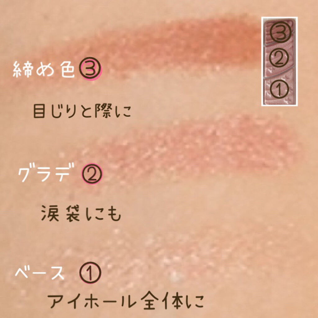 - 3色で簡単に明るく大きな目元に。 しっとり感触のアイシャドウ。 くすみを飛ばす明るさベース、ひとえ・奥二重の方でも幅広く塗れる肌なじみの良い中間色、 濃密高発色の締め色が目の輪郭を強調し大きな目元に。 微細パール配合でくすみを飛ばし、明るい目元へ。
