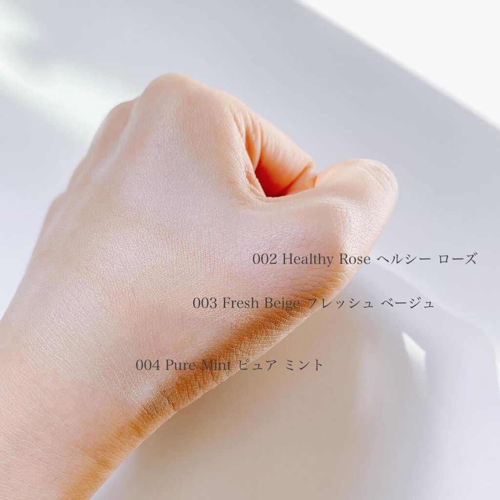 - <001 Fair Lavender> 水、BG、ミネラルオイル、ジメチコン、メトキシケイヒ酸エチルヘキシル、エタノール、メチレンビスベンゾトリアゾリルテトラメチルブチルフェノール、グリセリン、ジカプリン酸PG、ステアリン酸、ナイロン-12、イソノナン酸イソトリデシル、ビスエチルヘキシルオキシフェノールメトキシフェニルトリアジン、アスコルビン酸、オリーブ果実油、カニナバラ果実油、ゴマ種子油、サフラワー油、シロキクラゲエキス、ジパルミチン酸アスコルビル、テトラヘキシルデカン酸アスコルビル、トコフェロール、ホホバ種子油、BHT、EDTA-2Na、PEG-10水添ヒマシ油、TEA、(アクリレーツ/アクリル酸アルキル(C10-30))クロスポリマー、アクリレーツコポリマー、アルミナ、カルボマー、キサンタンガム、ジエチルアミノヒドロキシベンゾイル安息香酸ヘキシル、ステアリン酸グリセリル、セテアリルアルコール、タルク、トリセテアレス-4リン酸、ヒドロキシアパタイト、ベヘニルアルコール、ポリソルベート80、ラウリル硫酸Na、ラウリン酸ポリグリセリル-10、レシチン、合成金雲母、酸化スズ、水酸化Al、水添レシチン、フェノキシエタノール、グンジョウ、マイカ、酸化チタン、酸化亜鉛、酸化鉄 <002 Healthy Rose> 水、BG、ミネラルオイル、ジメチコン、メトキシケイヒ酸エチルヘキシル、エタノール、メチレンビスベンゾトリアゾリルテトラメチルブチルフェノール、グリセリン、ジカプリン酸PG、ステアリン酸、タルク、ナイロン-12、イソノナン酸イソトリデシル、ビスエチルヘキシルオキシフェノールメトキシフェニルトリアジン、アスコルビン酸、オリーブ果実油、カニナバラ果実油、ゴマ種子油、サフラワー油、シロキクラゲエキス、ジパルミチン酸アスコルビル、テトラヘキシルデカン酸アスコルビル、トコフェロール、ホホバ種子油、BHT、EDTA-2Na、PEG-10水添ヒマシ油、TEA、(アクリレーツ/アクリル酸アルキル(C10-30))クロスポリマー、アクリレーツコポリマー、アルミナ、カルボマー、キサンタンガム、ジエチルアミノヒドロキシベンゾイル安息香酸ヘキシル、ステアリン酸グリセリル、セテアリルアルコール、トリセテアレス-4リン酸、ヒドロキシアパタイト、ベヘニルアルコール、ポリソルベート80、ラウリル硫酸Na、ラウリン酸ポリグリセリル-10、レシチン、合成金雲母、酸化スズ、水酸化Al、水添レシチン、フェノキシエタノール、グンジョウ、マイカ、酸化チタン、酸化亜鉛、酸化鉄、赤226 <003 Fresh Beige> 水、BG、ミネラルオイル、ジメチコン、メトキシケイヒ酸エチルヘキシル、エタノール、メチレンビスベンゾトリアゾリルテトラメチルブチルフェノール、グリセリン、ジカプリン酸PG、ステアリン酸、ナイロン-12、イソノナン酸イソトリデシル、ビスエチルヘキシルオキシフェノールメトキシフェニルトリアジン、アスコルビン酸、オリーブ果実油、カニナバラ果実油、ゴマ種子油、サフラワー油、シロキクラゲエキス、ジパルミチン酸アスコルビル、テトラヘキシルデカン酸アスコルビル、トコフェロール、ホホバ種子油、BHT、EDTA-2Na、PEG-10水添ヒマシ油、TEA、(アクリレーツ/アクリル酸アルキル(C10-30))クロスポリマー、アクリレーツコポリマー、アルミナ、カルボマー、キサンタンガム、ジエチルアミノヒドロキシベンゾイル安息香酸ヘキシル、ステアリン酸グリセリル、セテアリルアルコール、タルク、トリセテアレス-4リン酸、ヒドロキシアパタイト、ベヘニルアルコール、ポリソルベート80、ラウリル硫酸Na、ラウリン酸ポリグリセリル-10、レシチン、合成金雲母、酸化スズ、水酸化Al、水添レシチン、フェノキシエタノール、マイカ、酸化チタン、酸化亜鉛、酸化鉄 <004 Pure Mint> 水、BG、ミネラルオイル、ジメチコン、メトキシケイヒ酸エチルヘキシル、エタノール、メチレンビスベンゾトリアゾリルテトラメチルブチルフェノール、グリセリン、ジカプリン酸PG、ステアリン酸、ナイロン-12、イソノナン酸イソトリデシル、ビスエチルヘキシルオキシフェノールメトキシフェニルトリアジン、アスコルビン酸、オリーブ果実油、カニナバラ果実油、ゴマ種子油、サフラワー油、シロキクラゲエキス、ジパルミチン酸アスコルビル、テトラヘキシルデカン酸アスコルビル、トコフェロール、ホホバ種子油、BHT、EDTA-2Na、PEG-10水添ヒマシ油、TEA、(アクリレーツ/アクリル酸アルキル(C10-30))クロスポリマー、アクリレーツコポリマー、アルミナ、カルボマー、キサンタンガム、ジエチルアミノヒドロキシベンゾイル安息香酸ヘキシル、ステアリン酸グリセリル、セテアリルアルコール、タルク、トリセテアレス-4リン酸、ヒドロキシアパタイト、ベヘニルアルコール、ポリソルベート80、ラウリル硫酸Na、ラウリン酸ポリグリセリル-10、レシチン、合成金雲母、酸化スズ、水酸化Al、水添レシチン、フェノキシエタノール、グンジョウ、マイカ、酸化チタン、酸化亜鉛、酸化鉄、黄4、青1