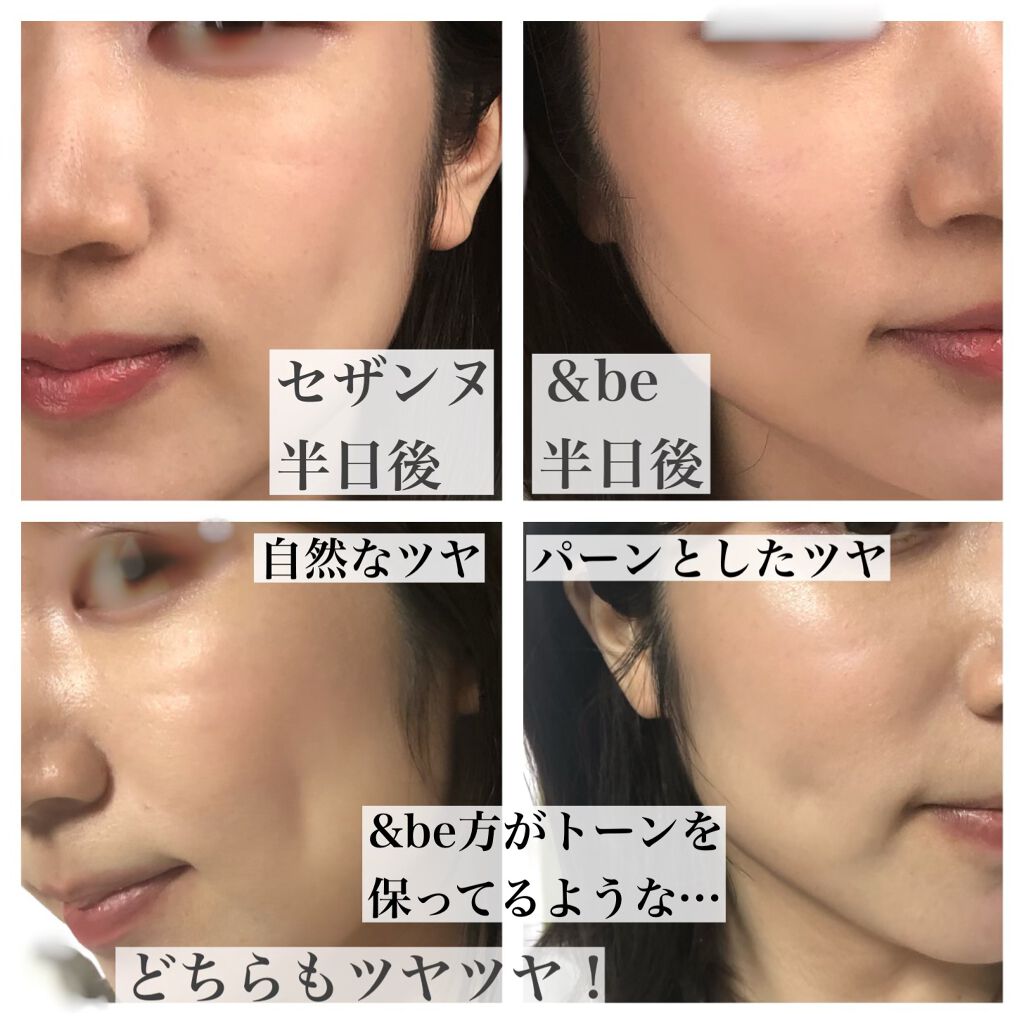 &beの方がもったりして保湿感があり、塗り終わってもしっとりめ、セザンヌは伸ばしやすいが塗ったらサラっとすべすべになります。 &beがパーンと張った白めの透明感の発光肌 セザンヌが自然なツヤ感の自然にトーンアップされた上品なツヤ肌 &beのほうが強いツヤというだけでセザンヌもファンデを重ねてもツヤが分かるくらいにちゃんと艶肌にしてくれます &beの方トーンアップの白さ&ツヤが強いのがよりわかりました。 セザンヌの方がウォータプルーフ&サラサラ仕上げなのでセザンヌの方が落ちにくさを重視する方に &beは石鹸オフなので落としやすさが重視の方はこちら 一番違うのは保湿感があるか、サラッとしてるかの違いなので、迷ってる方は乾燥肌なら&be、脂性肌よりならセザンヌをおすすめします &beはオレンジの精油の香りがするのである、あまり匂いが好きでない方はセザンヌですね