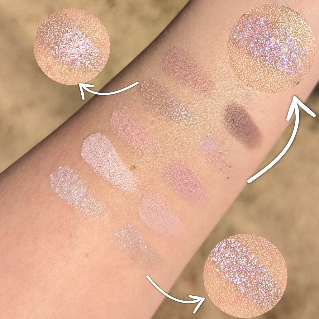 マットの発色をご覧ください。 マットでここまで発色するのって、珍しい。 特にパープル系のマットは、作るのが難しいらしく、ハイブランドでも発色がよくブレンドしやすいマットパープルを作るのに苦労するそう。 ですがこちらのaztkのマットパープルは、一塗りですんごい発色。 しっとりしているわけではないのですが、しっかり密着してくれる感じもします。 逆にパール系は少し発色優しめかな?と思いますが、ニュアンス的に使う分には問題なし。 ラメはギラギラのラメではなくチラチララメで、とっても上品。 いろんなシャドウと組み合わせて無限大にアイメイクが楽しめそうです。