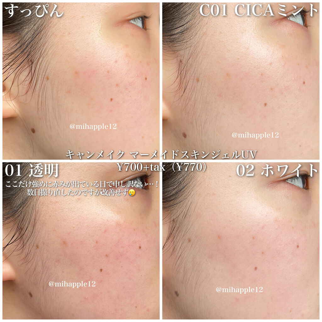 お待たせしてしまいました💦キャンメイクの化粧下地、マーメイドスキンジェルUVのレビューです。手持ちの色三種類を比較していきます❣️☑︎キャンメイクマーメイドスキンジェルUV02 ホワイトC01 CICAミントC03 ピュアパープル¥770・S...