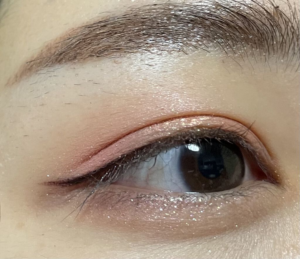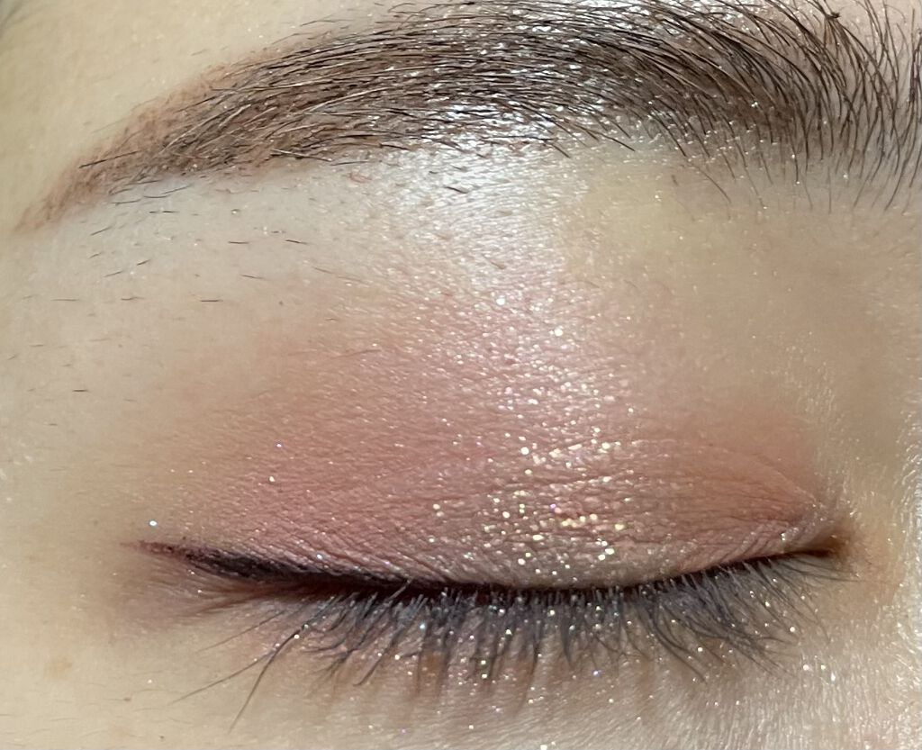 今回のアイシャドウは想像していたよりも発色が淡めでした。腕に出す時はなんぼでもぐりぐり濃くできますが、まぶたにのせる時は優しく何度も重ね塗りしなければなりませんでした。 ラメが超尊いです😍 あと、カラーアイライナーも超オススメです!発色もフェルトの描きやすさも落ちにくさも文句無しです!