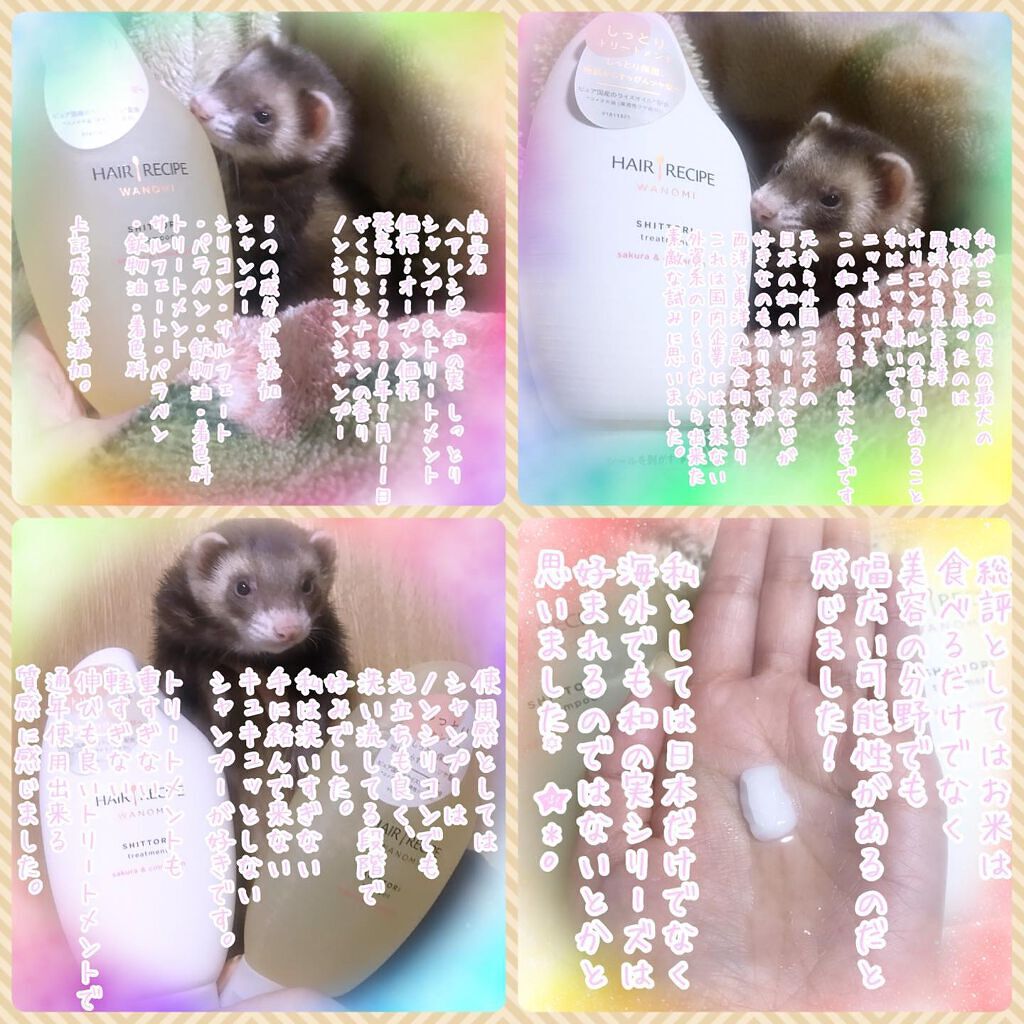 - ヘアレシピ『和の実』から誕生。 髪のスーパーフード「ライスオイル」配合の、お米発想のヘアケア。 乾燥してパサついた髪におすすめな、「しっとり」シャンプー&トリートメント。 髪の内側に「ライスオイル」が浸透し、乾燥した髪を根元から毛先までしっかり保湿。地肌からしっとり、すっぴんツヤ髪へ。 さくらとシナモンの香りです。 5つの成分無添加:シリコン、サルフェート、パラベン、鉱物油、着色料フリー。 なのに、ふんわりもちもちの泡でしっとりとした仕上がりに。 ※トリートメントは、サルフェート、パラベン、鉱物油、着色料フリー。