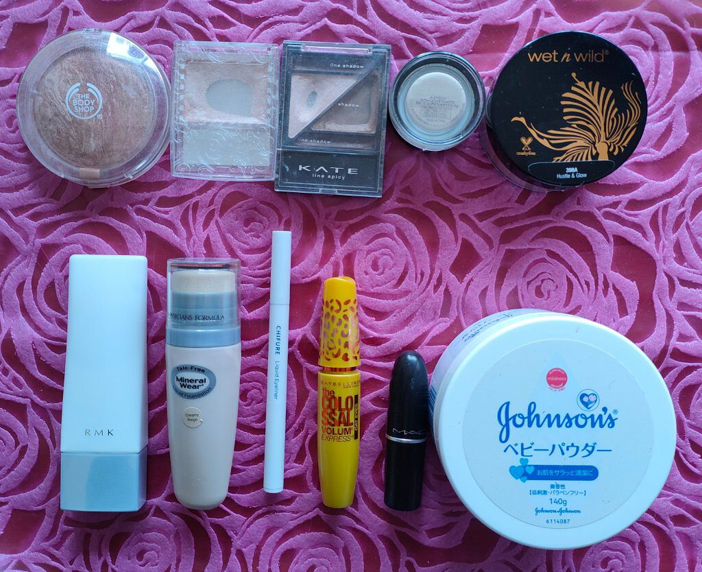 アリィー ニュアンスチェンジUV ジェル RSを、顔全体にまんべんなく塗ります。 RMK RMK ジェルクリーミィファンデーション 103を、顔全体にまんべんなく塗ります。 ジョンソンベビー ジョンソン ベビーパウダーを、顔全体にまんべんなく軽くはたきます。 THE BODY SHOP bronze shade warm glowを、両頬に塗ります。 KATE リフレクトミラーアイズ BR-1の締め色を、眉毛全体にまんべんなく塗ります。 URGLAM UR GLAMBLOOMING EYE COLOR PALETTE 01を、使用しました。 ちふれ リキッド アイライナー 筆ペンタイプ BK30 ブラックを、塗ります。 CEZANNE エアリーカールマスカラを、まつ毛全体にまんべんなく塗ります。 MAYBELLINE NEW YORK コロッサルボリュームエクスプレスを、まつ毛全体にまんべんなく塗ります。 MAYBELLINE NEW YORK SPステイ マットインク 135を、唇全体にまんべんなく塗ります。