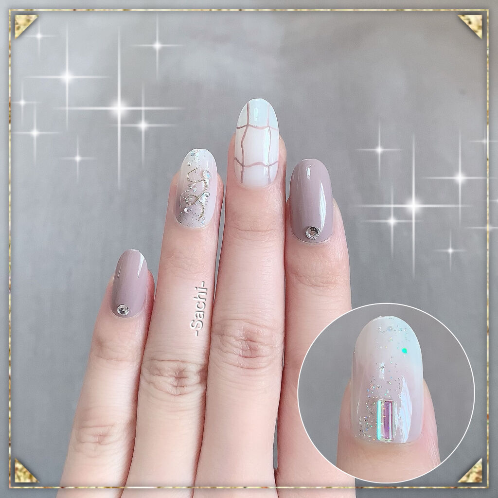 ワンカラーでも指ごとに色を変えるだけでオシャレに見えます💕 画像のようにゴールドラインとストーンを少し足すだけで華やかさがアップ🥰 何度かご紹介したことのあるスポンジで作るグラデーションです✨ スポンジを使うことで境目が綺麗に馴染んでくれます💕 アルミホイルの上でブラウンとトップコートを1:1くらいで混ぜたものを、トップコートのハケに取って3箇所に塗るだけ👌 事前に混ぜたものを塗ることで、爪の上でぼかすより簡単に出来ます💕 ベースカラーが乾く前に点置きしてぼかすことで綺麗にぼかせます✨ スピードが大事なので、使うポリッシュのキャップは全て開けておきましょう😊 天然石のラインはガタガタの方がより天然石っぽく見えるので、ラインを描くのが苦手な方でも大丈夫🙆♀️ 難しそうに見えて、やってみると意外と簡単に出来ます♡